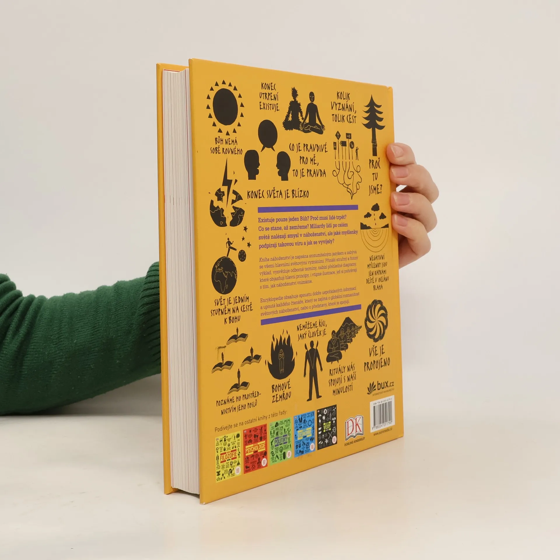 Kniha náboženství je další publikace z edice přehledových oborových publikací (Kniha filozofie, Kniha psychologie, Kniha ekonomie, Kniha vědy), určených pro nejširší veřejnost od úplných začátečníků až po pokročilé studenty a odborníky. Nabízí obsáhlý přehled všech hlavních světových náboženství, jejich vzniku, vývoje, podstaty a vzájemných souvislostí. Hutný výklad v moderní grafické úpravě doprovázejí srozumitelné diagramy, které objasňují hlavní principy.