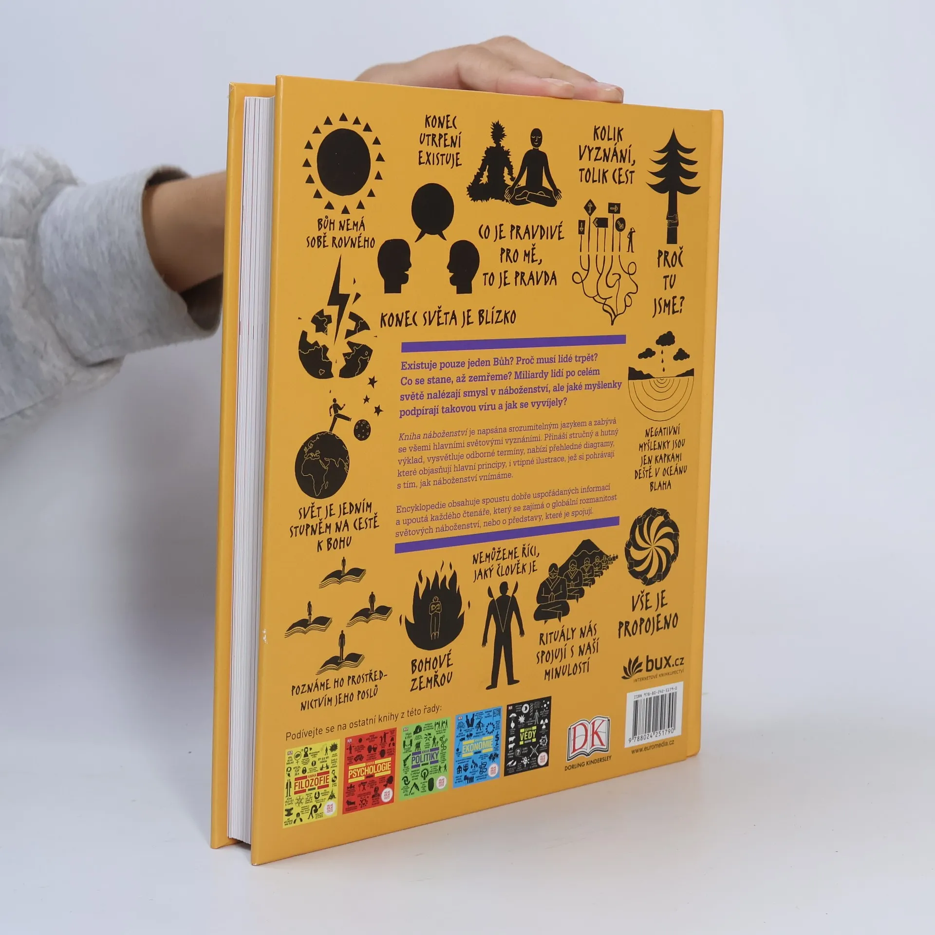 Kniha náboženství je další publikace z edice přehledových oborových publikací (Kniha filozofie, Kniha psychologie, Kniha ekonomie, Kniha vědy), určených pro nejširší veřejnost od úplných začátečníků až po pokročilé studenty a odborníky. Nabízí obsáhlý přehled všech hlavních světových náboženství, jejich vzniku, vývoje, podstaty a vzájemných souvislostí. Hutný výklad v moderní grafické úpravě doprovázejí srozumitelné diagramy, které objasňují hlavní principy.