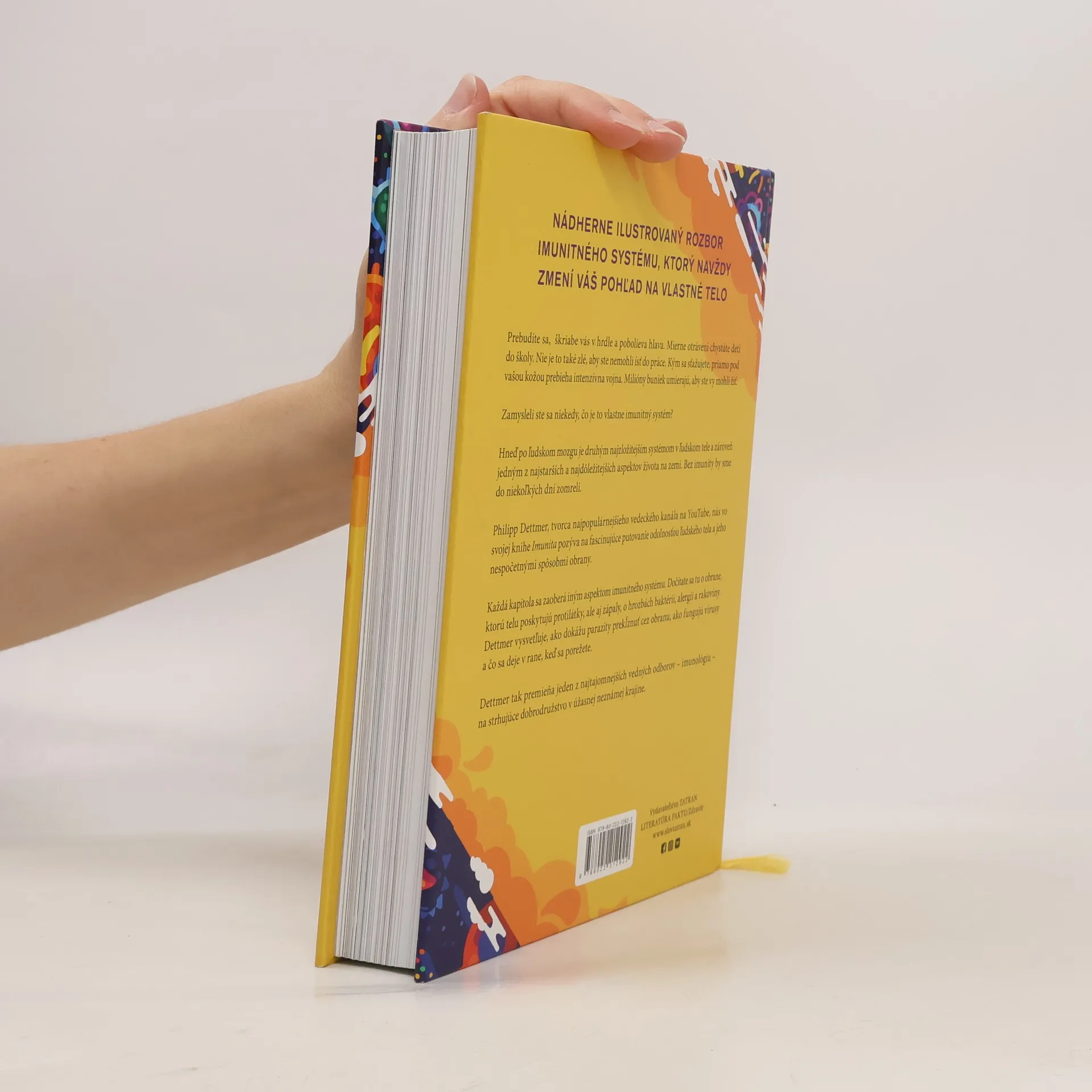 Prebudíte sa s bolesťou v hrdle a hlave, ale chystáte deti do školy a idete do práce. Kým sa sťažujete, vo vašom tele prebieha intenzívna vojna, kde milióny buniek umierajú, aby ste mohli žiť. Zamysleli ste sa niekedy, čo je imunitný systém? Hneď po mozgu je druhým najzložitejším systémom v tele a jedným z najstarších aspektov života. Bez imunity by sme zomreli za pár dní. Autor nás pozýva na fascinujúce putovanie odolnosťou ľudského tela a jeho obrannými mechanizmami. V tele prebieha zúrivý boj, kde miliardy imunitných buniek čelí choroboplodným mikroorganizmom a vytvára zložité obranné stratégie. Každá kapitola sa zaoberá iným aspektom imunitného systému, od protilátok a zápalov po hrozby baktérií, alergií a rakoviny. Dettmer vysvetľuje, ako parazity prekĺznu cez obranu a čo sa deje v rane pri porezaní. Kniha je dôvtipným a zábavným rýchlokurzom o práci tohto dôležitého systému, obohatená farebnými grafikami a pútavými opismi, ktoré premieňajú imunológiu na strhujúce dobrodružstvo.