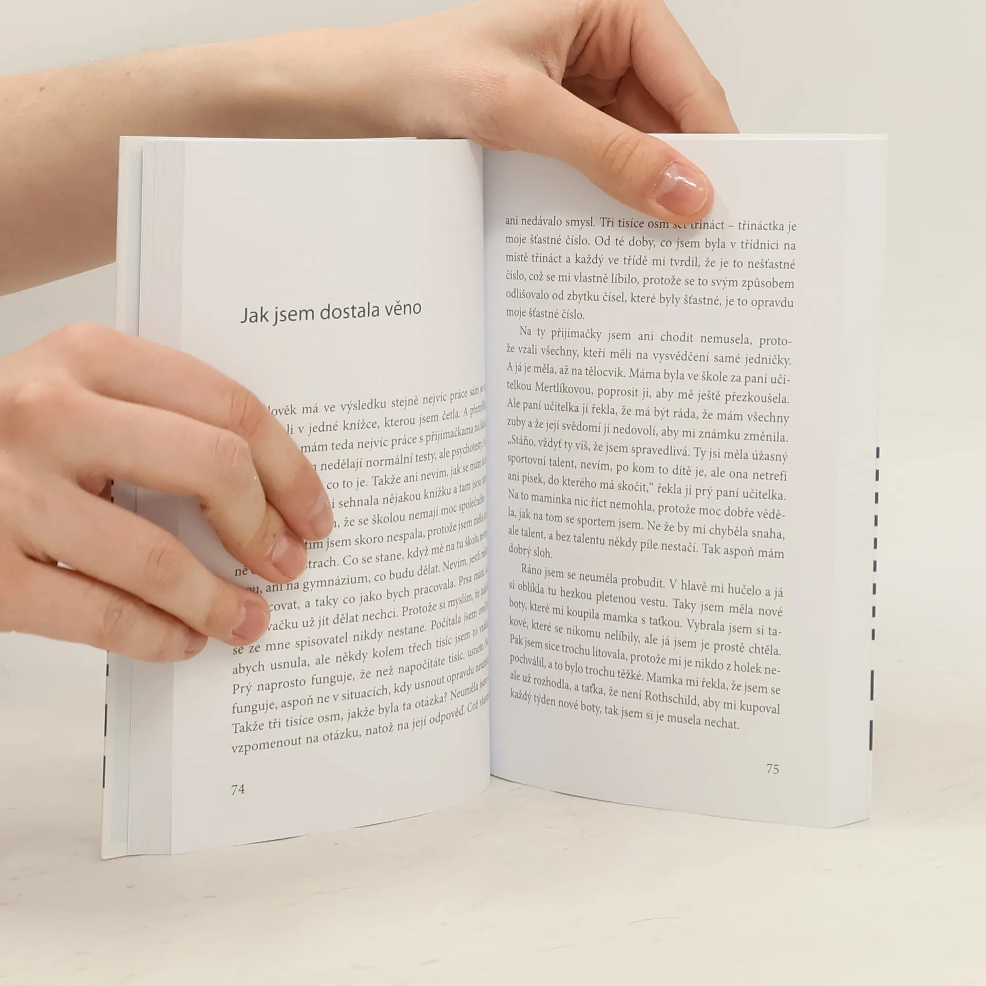 Neuměla šplhat. Chtěla být prodavačkou jako teta Bedřiška s velkýma prsama. Nenáviděla kostel, do kterého musela chodit, a nechtěla vodit svého bratra do školky, protože byl tlustý a do punčocháčů jí s ním museli pomáhat ostatní. Měla ráda knížky a nechápala, proč ostatní ne. Měla jiné zapínání na školní aktovce a myslela si, že to je ten důvod, proč jí do její oblíbené knížky malují kosočtverce. Krátké kapitoly, vtipně odrážející dění na vesnici, trampoty dospívajícího člověka i těžké soužití s rodiči, kteří se vzali pouze a jenom kvůli vesnickým konvencím, nicméně ukazují, že je možné život brát i z té veselejší stránky. I když si na ten okamžik někdy musíte chvíli počkat. To, co se v jí dětství zdálo jako fakt a v patnácti vypadalo jako špatný sen, v osmnácti přerostlo v něco, kvůli čemu stálo za to sáhnout si na život. Na samotném konci však zjistíme, že na každý problém existují pouze dva úhly pohledu. A ten pozitivní vyhrává.