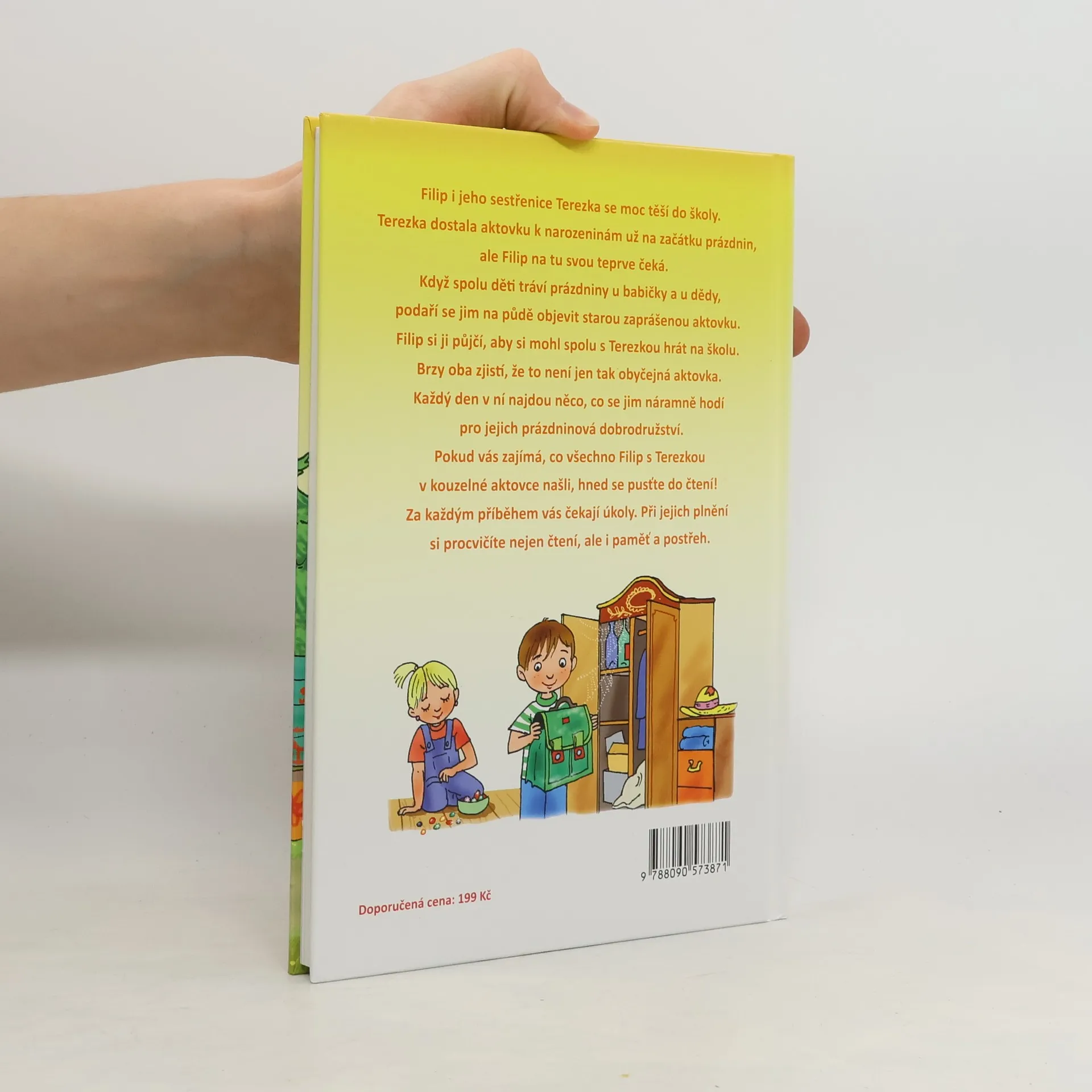 Filip i jeho sestřenice Terezka se moc těší do školy. Terezka dostala aktovku k narozeninám už na začátku prázdnin, ale Filip na tu svou teprve čeká. Když spolu děti tráví prázdniny u babičky a u dědy, podaří se jim na půdě objevit starou zaprášenou aktovku. Filip si ji půjčí, aby si mohl spolu s Terezkou hrát na školu. Brzy oba zjistí, že to není jen tak obyčejná aktovka. Každý den v ní najdou něco, co se jim náramně hodí pro jejich prázdninová dobrodružství. Pokud vás zajímá, co všechno Filip s Terezkou v kouzelné aktovce našli, hned se pusťte do čtení! Za každým příběhem na vás čekají úkoly. Při jejich plnění si procvičíte nejen čtení, ale i paměť a postřeh.