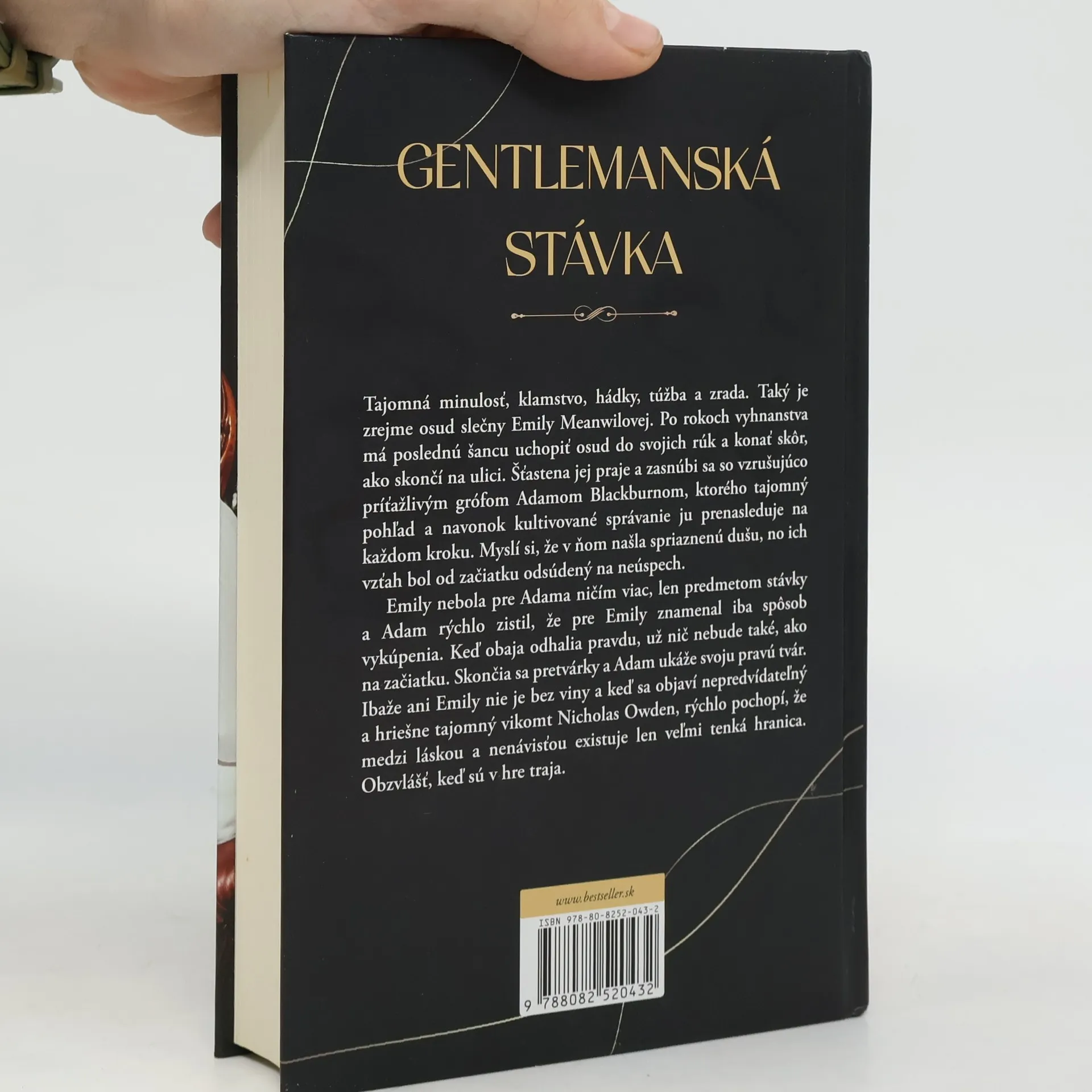 Tajomná minulosť, klamstvo, hádky, túžba a zrada. Taký je zrejme osud slečny Emily Meanwilovej. Po rokoch vyhnanstva má poslednú šancu uchopiť osud do svojich rúk a konať skôr, ako skončí na ulici. Šťastena jej praje a zasnúbi sa so vzrušujúco príťažlivým grófom Adamom Blackburnom, ktorého tajomný pohľad a navonok kultivované správanie ju prenasleduje na každom kroku. Myslí si, že v ňom našla spriaznenú dušu, no ich vzťah bol od začiatku odsúdený na neúspech.Emily nebola pre Adama ničím viac, len predmetom stávky a Adam rýchlo zistil, že pre Emily znamenal iba spôsob vykúpenia. Keď obaja odhalia pravdu, už nič nebude také, ako na začiatku. Skončia sa pretvárky a Adam ukáže svoju pravú tvár.Ibaže ani Emily nie je bez viny a keď sa objaví nepredvídateľný a hriešne tajomný vikomt Nicholas Owden, rýchlo pochopí, že medzi láskou a nenávisťou existuje len veľmi tenká hranica. Obzvlášť, keď sú v hre traja.