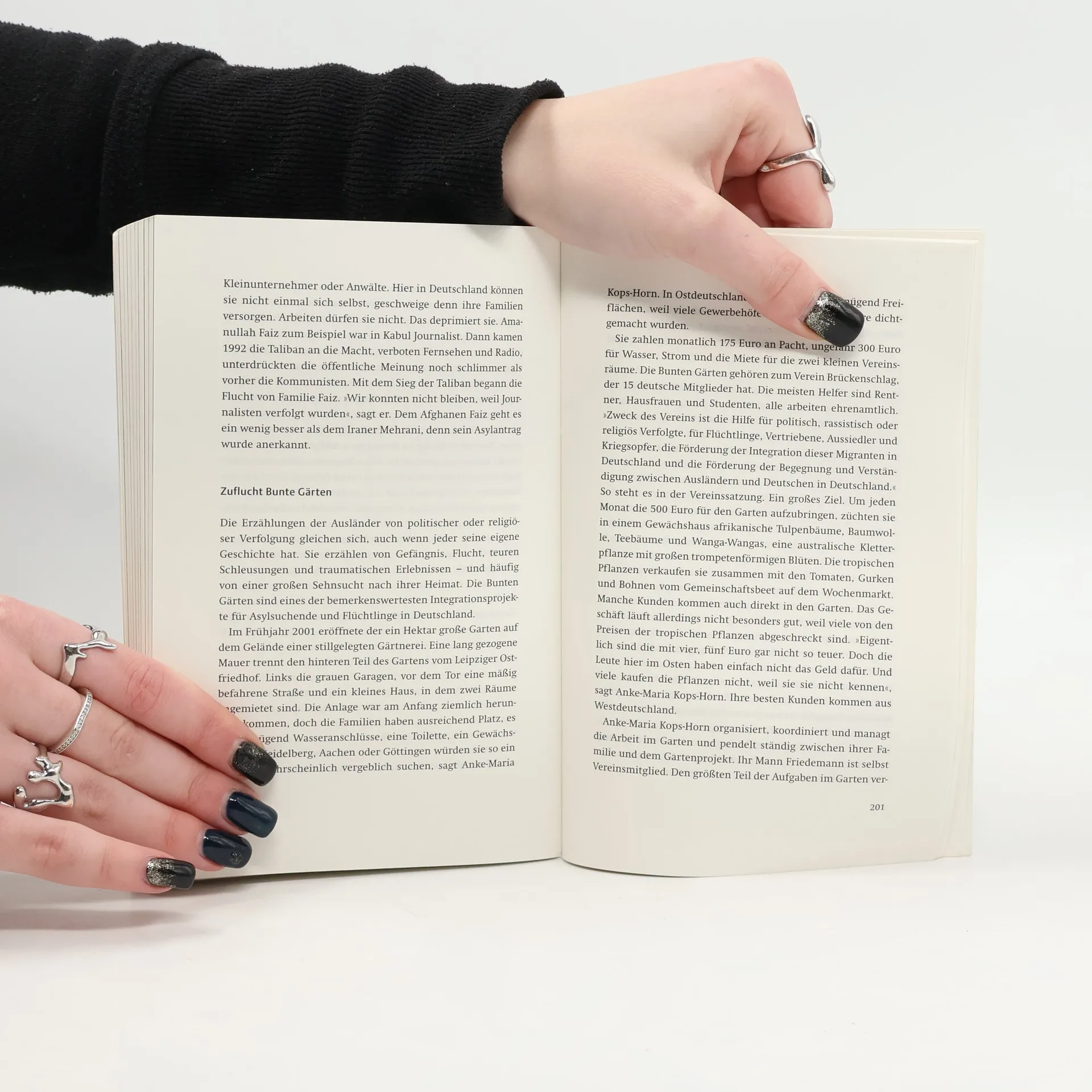 Die Protagonisten stammen aus Afghanistan, dem Iran, Irak, Serbien oder Syrien und fliehen aus ihrer Heimat in Angst und Sehnsucht. Ihre Zukunft in Deutschland bleibt ungewiss, da sie auf Asyl hoffen. In Leipzig finden sie einen Ort der Ruhe und Gemeinschaft: die 'Bunten Gärten', eine Initiative eines engagierten Ehepaars, die Asylbewerber und ihre Familien unterstützt, den Kreislauf von Isolation und Apathie zu durchbrechen. Das Projekt ermöglicht ihnen, die lange Wartezeit sinnvoll zu nutzen. In den 'Bunten Gärten' können sie säen und ernten, sich treffen, weiterbilden und neue Hoffnung schöpfen. Hier werden sie als Individuen wahrgenommen. Einige erzählen von ihren Fluchtgeschichten und der Verzweiflung, die sie erlebt haben. Sie berichten über ihre Heimat, ihre Erfahrungen in Deutschland, ihre Ängste und die Herausforderungen, in der fremden Umgebung Fuß zu fassen. Ihre Träume und Hoffnungen auf Sicherheit, Bildung und Perspektiven für sich und ihre Kinder werden deutlich. Ihre klaren und offenen Sichtweisen brechen Stereotypen über 'Asylanten' auf. Das Buch thematisiert Flüchtlinge, Asylbewerber und engagierte Bürger, die ein außergewöhnliches Gartenprojekt ins Leben gerufen haben, sowie die Mechanismen eines Grundrechts, das immer wieder politisch umstritten ist.