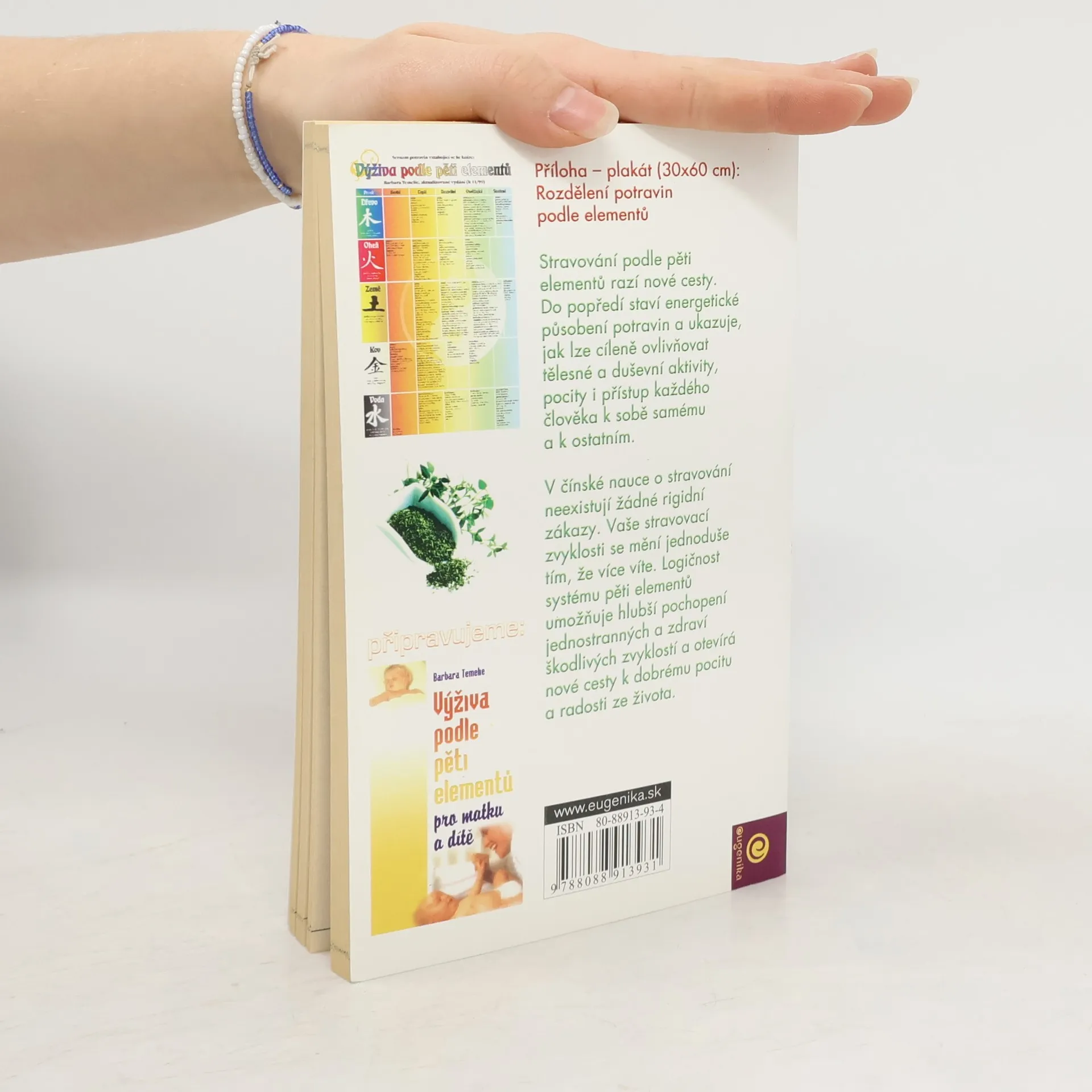 Stravování podle pěti elementů razí nové cesty. Do popředí staví energetické působení potravin a ukazuje, jak lze cíleně ovlivňovat tělesné a duševní aktivity, pocity i přístup každého člověka k sobě samému a k ostatním. V čínské nauce o stravování neexistují žádné rigidní zákazy. Vaše stravovací zvyklosti se mění jednoduše tím, že více víte. logičnost systému pěti elementů umožňuje hlubší pochopení jednostranných a zdraví škodlivých zvyklostí a otevírá nové cesty k dobrému pocitu a radosti ze života. Příloha - plakát (30x60 cm): Rozdělení potravin podle pěti elementů.