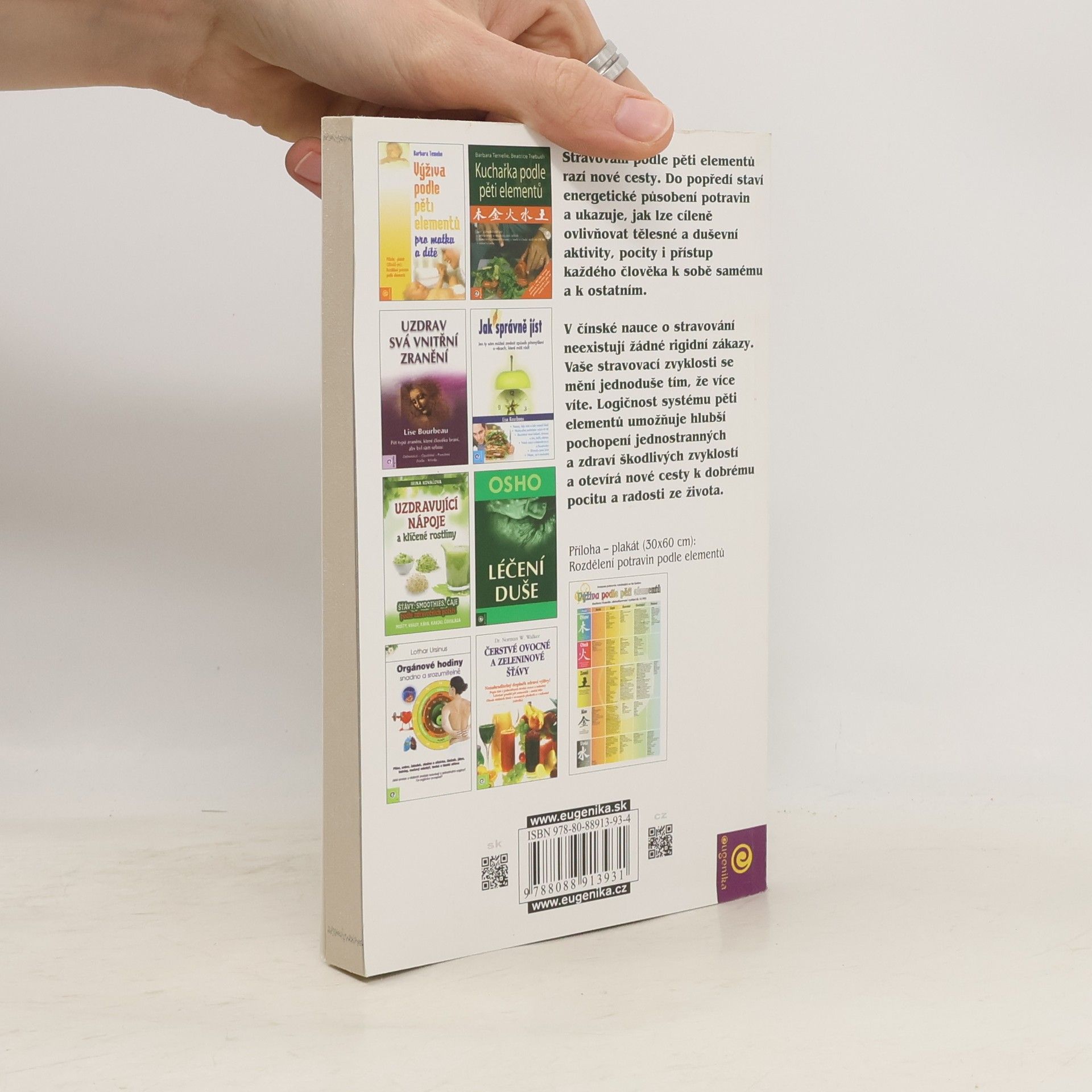 Stravování podle pěti elementů razí nové cesty. Do popředí staví energetické působení potravin a ukazuje, jak lze cíleně ovlivňovat tělesné a duševní aktivity, pocity i přístup každého člověka k sobě samému a k ostatním. V čínské nauce o stravování neexistují žádné rigidní zákazy. Vaše stravovací zvyklosti se mění jednoduše tím, že více víte. logičnost systému pěti elementů umožňuje hlubší pochopení jednostranných a zdraví škodlivých zvyklostí a otevírá nové cesty k dobrému pocitu a radosti ze života. Příloha - plakát (30x60 cm): Rozdělení potravin podle pěti elementů.