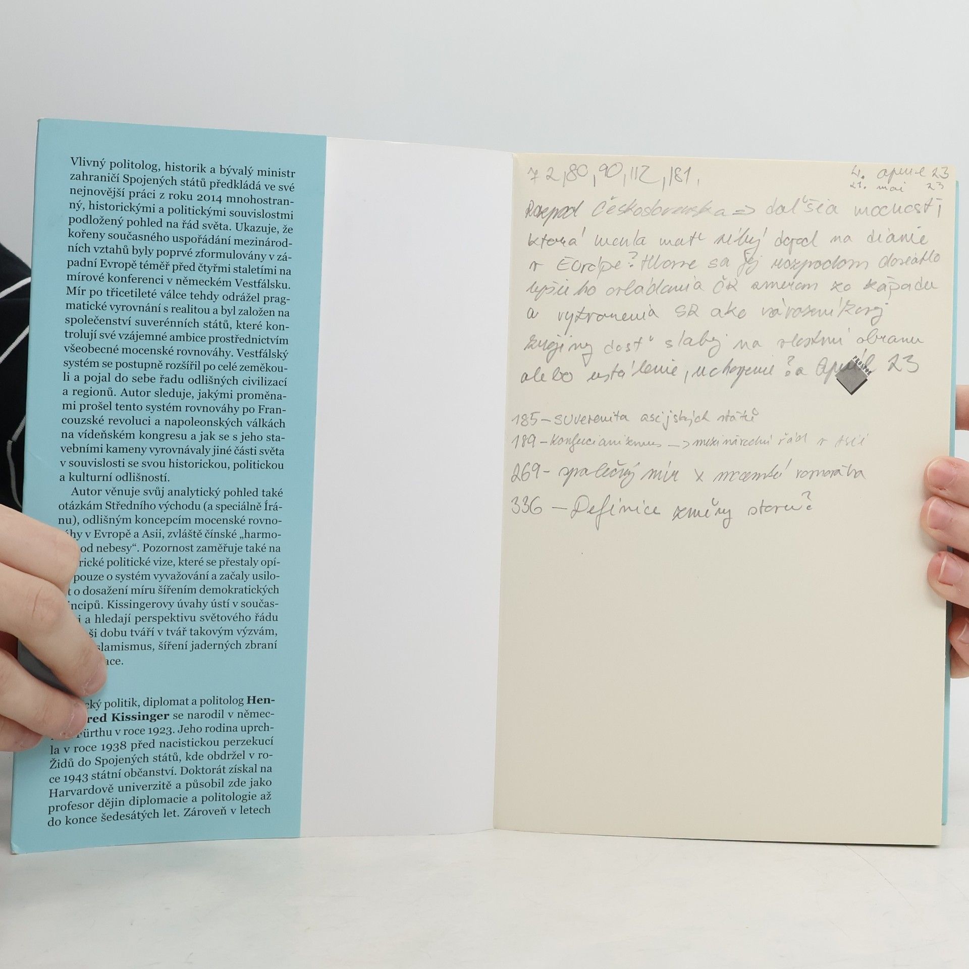 Druhé vydání zásadní práce vlivného politologa a bývalého ministra zahraničí USA z roku 2014 přináší mnohostranný pohled na současný světový řád, podložený historickými a politickými souvislostmi. Autor ukazuje, že kořeny mezinárodních vztahů byly poprvé formulovány v západní Evropě před čtyřmi stoletími na mírové konferenci ve Vestfálii. Mír po třicetileté válce byl pragmatickým vyrovnáním a založen na společenství suverénních států, které regulují své ambice prostřednictvím mocenské rovnováhy. Vestfálský systém se postupně rozšířil po celém světě a zahrnoval různé civilizace a regiony. Autor sleduje proměny tohoto systému po Francouzské revoluci a napoleonských válkách a zkoumá, jak se s jeho základy vyrovnávaly jiné části světa s ohledem na jejich historické a kulturní odlišnosti. Analyticky se věnuje také otázkám Středního východu, zejména Íránu, a různým koncepcím mocenské rovnováhy v Evropě a Asii, včetně čínské „harmonie pod nebesy“. Pozornost věnuje také americkým politickým vizím, které se posunuly od vyvažování k šíření demokratických principů. Kissingerovy úvahy hledají perspektivu světového řádu tváří v tvář výzvám, jako je islamismus, šíření jaderných zbraní a globalizace.