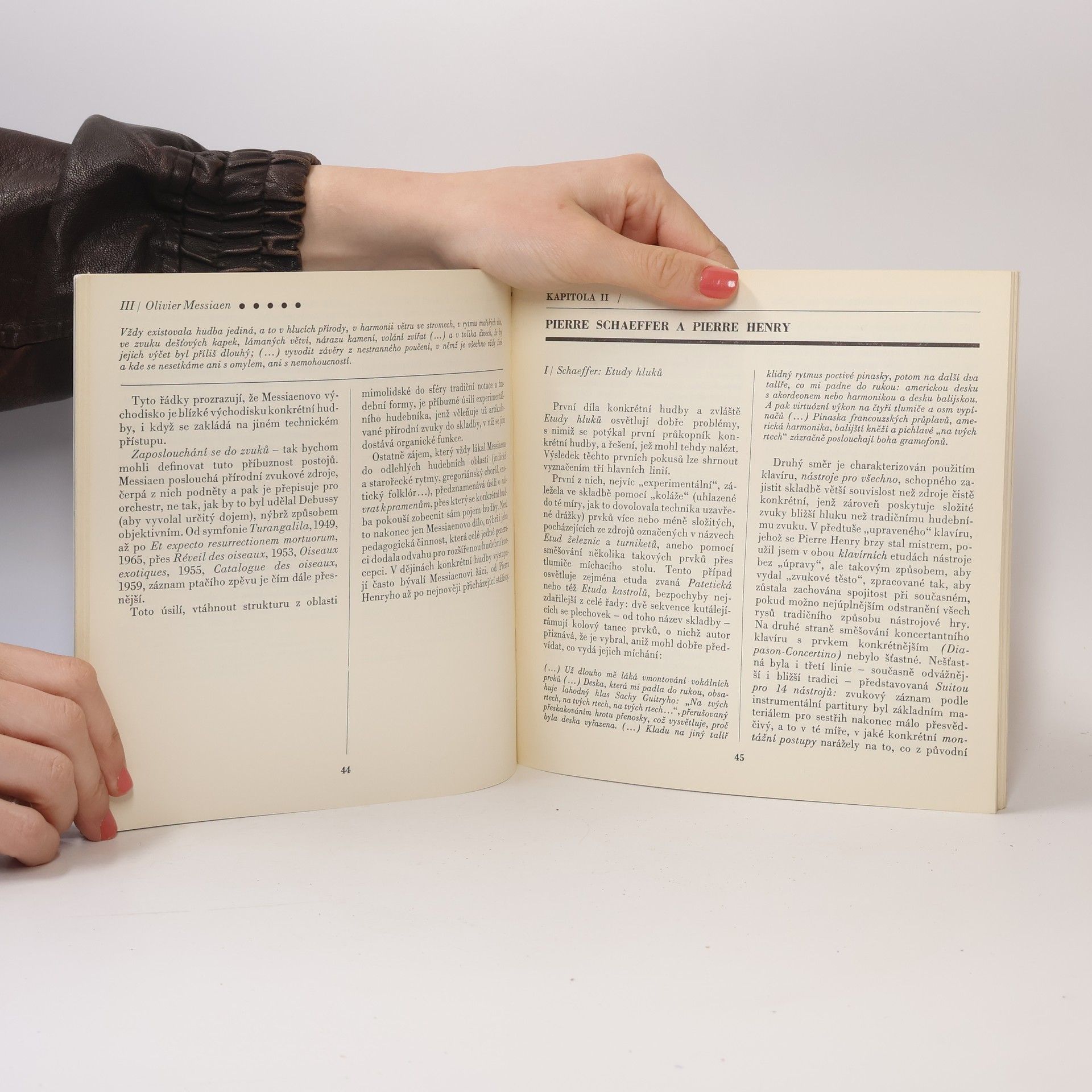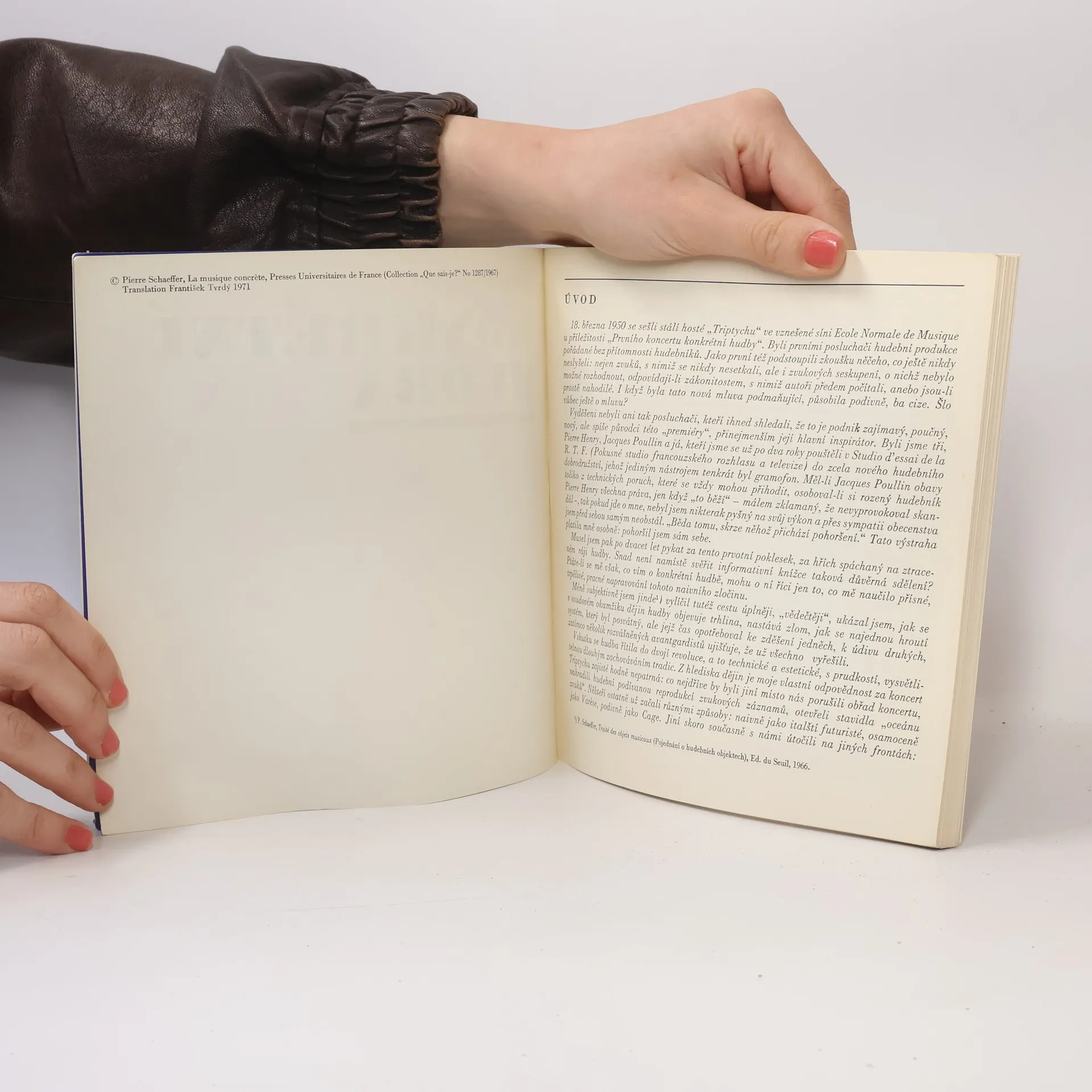 Informativní studie o tzv. "nové" hudbě, pěstované v prvních dvou desítkách druhé poloviny tohoto století a nazývané na rozdíl od hudby abstraktní, tj. hudby předem v mysli koncipované, potom v notách zaznamenané a konečně realizované v živém provedení, hudbou konkrétní, a to proto, že jejím materiálem je zvuk ve stavu zrodu, jak ho poskytuje příroda a jak ho zachycují stroje. Francouzský autor, první průkopník tohoto oboru, se v prvé části zabývá zejména inspirací, výzkumem a praktickou činností a ve druhé části uvádí jednotlivé autory a jejich díla, a to nejprve jmenuje předchůdce tohoto žánru, dále pak skupiny autorů, zahraniční školy včetně Ameriky a konečně sepodrobně zabývá Pařížskou školou.