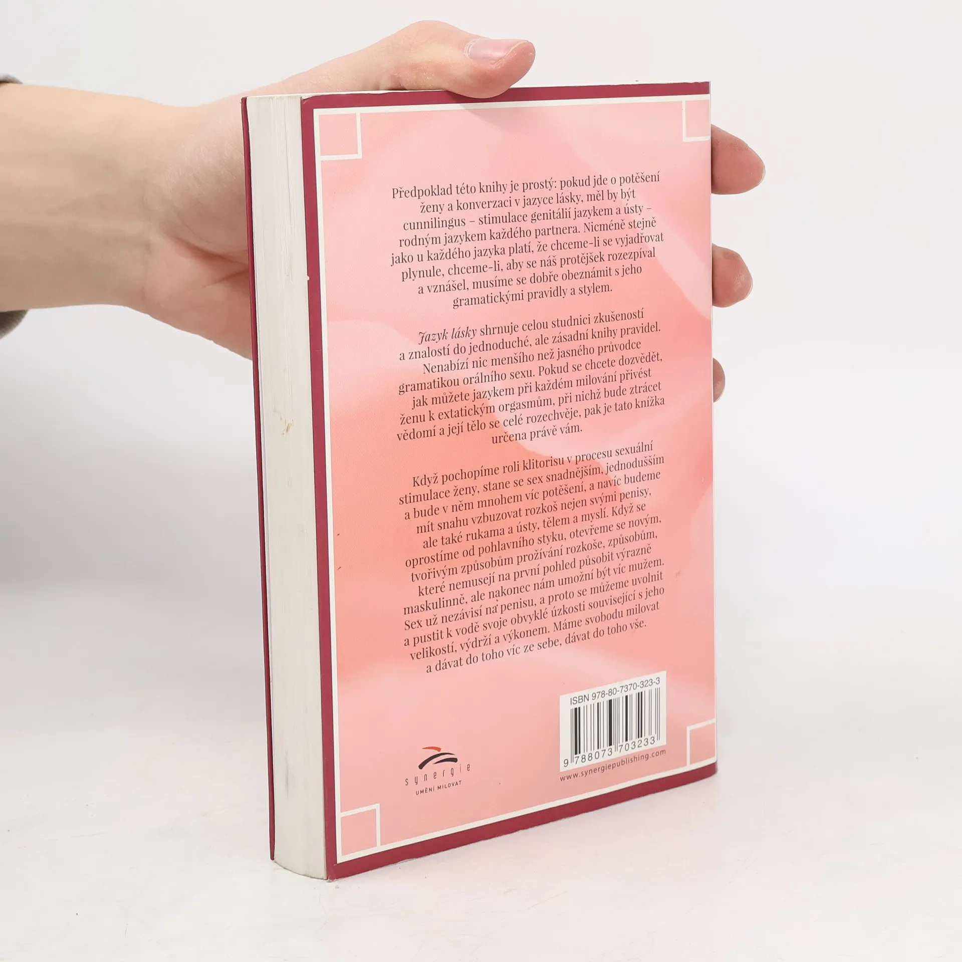 Průvodce muže potěšením ženy. Předpoklad této knihy je prostý: pokud jde o potěšení ženy a konverzaci v jazyce lásky, měl by být cunnilingus - stimulace genitálií jazykem a ústy - rodným jazykem každého partnera. Nicméně stejně jako u každého jazyka platí, že chceme-li se vyjadřovat plynule, chceme-li, aby se náš protějšek rozezpíval a vznášel, musíme se dobře obeznámit s jeho gramatickými pravidly a stylem. Jazyk lásky shrnuje celou studnici zkušeností a znalostí do jednoduché, ale zásadní knihy pravidel. Nenabízí nic menšího než jasného průvodce gramatikou orálního sexu. Pokud se chcete dozvědět, jak můžete jazykem při každém milování přivést ženu k extatickým orgasmům, při nichž bude ztrácet vědomí a její tělo se celé rozechvěje, pak je tato knížka určena právě vám. Když pochopíme roli klitorisu v procesu sexuální stimulace ženy, stane se sex snadnějším, jednodušším a bude v něm mnohem víc potěšení, a navíc budeme mít snahu vzbuzovat rozkoš nejen svými penisy, ale také rukama a ústy, tělem a myslí. Když se oprostíme od pohlavního styku, otevřeme se novým, tvořivým způsobům prožívání rozkoše, způsobům, které nemusejí na první pohled působit výrazně maskulinně, ale nakonec nám umožní být víc mužem. Sex už nezávisí na penisu, a proto se můžeme uvolnit a pustit k vodě svoje obvyklé úzkosti související s jeho velikostí, výdrží a výkonem. Máme svobodu milovat a dávat do toho víc ze sebe, dávat do toho vše.