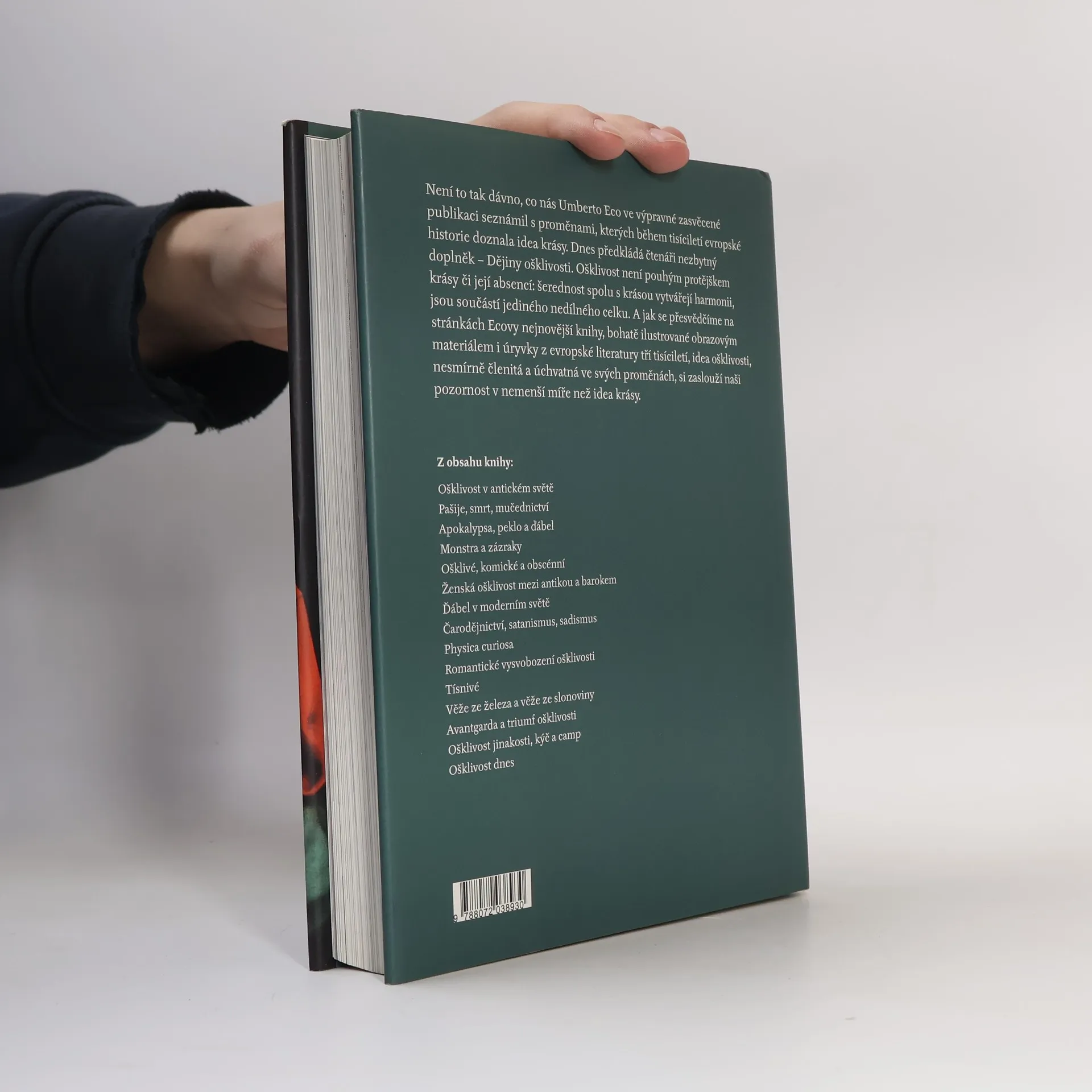 Nejnovější kniha Umberta Eca je jakýmsi protějškem jeho Dějin krásy. Co je vlastně opakem krásy? Na tuto otázku hledá autor odpověď na stránkách výpravné ilustrované publikace, kde na příkladech děl literárních i výtvarných ukazuje, že opak krásy se neomezuje jen na ohyzdnost satyrů či Harpyjí. Protějškem krásy jsou také groteskní tvary, odpudivé, dekadentní ovzduší opiových doupat, kam vstupuje Dorian Gray, svět vampírů i podivných bytostí vylovených z moře, neovladatelných pudů i děsu, prorockých vizí i apokalypsy, banálního zla i napohled směšných příhod. To vše není krásné, je to však podmanivé. Při četbě knihy nemůžeme nedat za pravdu moudrému Římanovi, když říká, že v přírodě není ošklivosti.