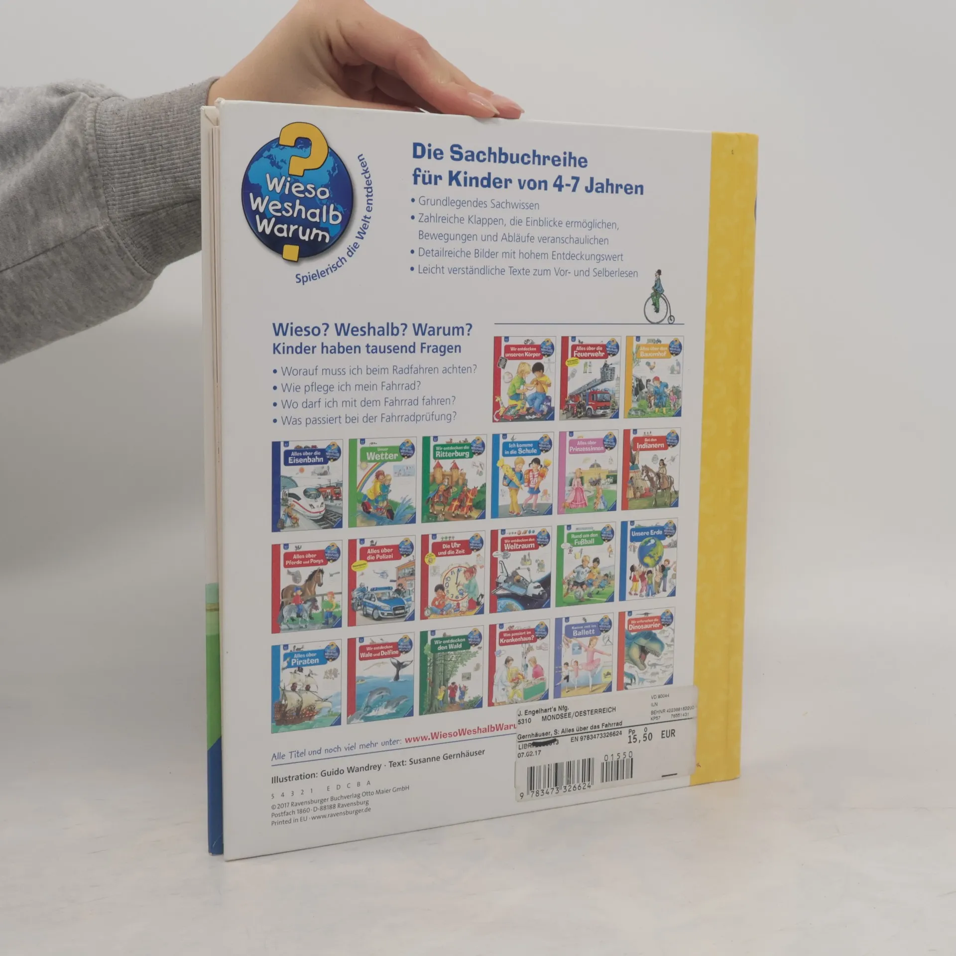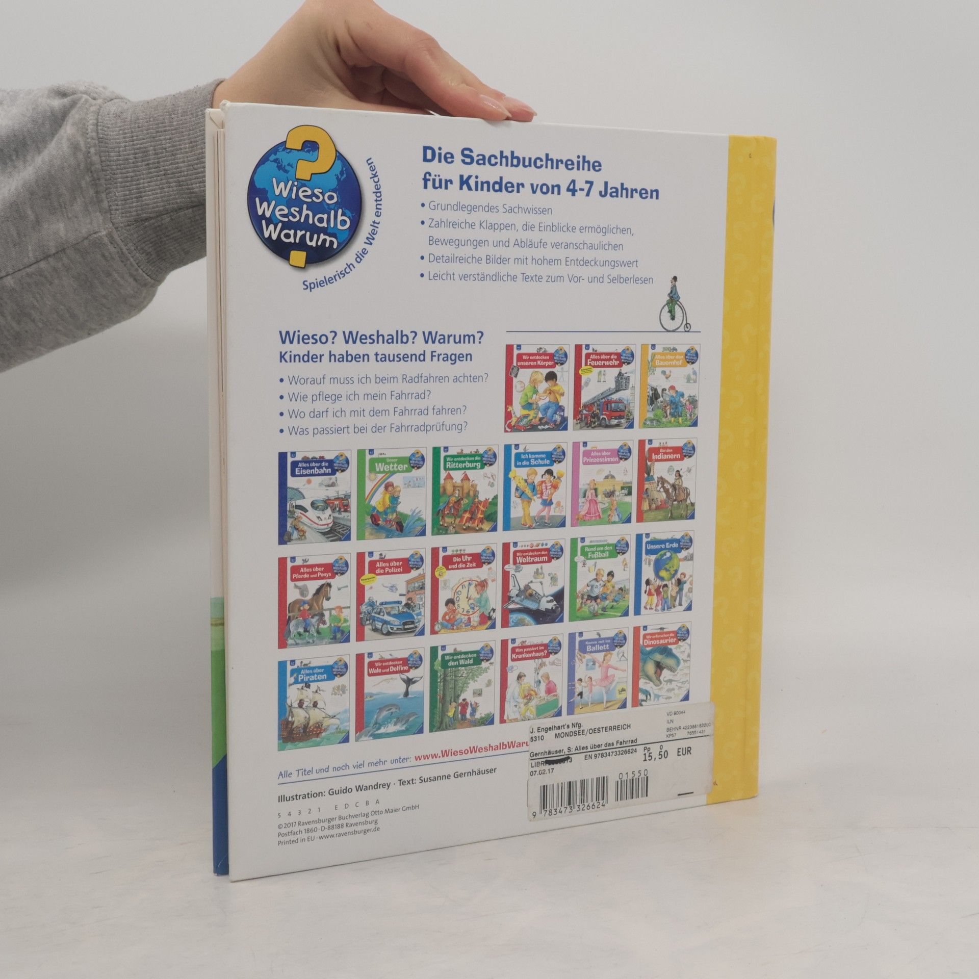 Hier dreht sich alles um den Drahtesel: Vom Kauf des ersten Fahrrads über die richtige Ausstattung bis zu wichtigen Verkehrsregeln und spezieller Ausrüstung. Welche Teile gehören zu einem Fahrrad? Wie pflege ich es richtig? Wo darf ich mit dem Rad fahren, und wieso brauche ich einen Helm? Zahlreiche Klappen, detailreiche Bilder und kurze Sachtexte vermitteln spielerisch die wichtigsten Fakten rund ums Rad. Ob ein Ausflug mit Mama und Papa oder der Weg zum Kindergarten: Fahrradfahren macht Spaß, ist gesund und gut für die Umwelt! Die Sachbuchreihe für Kinder von 4–7 Jahren beantwortet viele Fragen, die Kinder täglich stellen. Warum sind die Dinosaurier ausgestorben? Wo ist die Sonne in der Nacht? Wozu brauchen wir das Blut? Die beliebte Reihe gibt Antworten auf Augenhöhe und beleuchtet verschiedene Themen aus der Alltags- und Interessenswelt der Kinder altersgerecht und detailverliebt. Detailreiche Bilder, verständliche Sachtexte und überraschende Klappen veranschaulichen Bewegungen und Abläufe, sodass Kinder sich ihre Themen selbst erschließen können. Der Spaß am Entdecken, die liebevolle Umsetzung und die qualitativ hochwertige Ausstattung garantieren langanhaltende Freude an jedem einzelnen Buch.