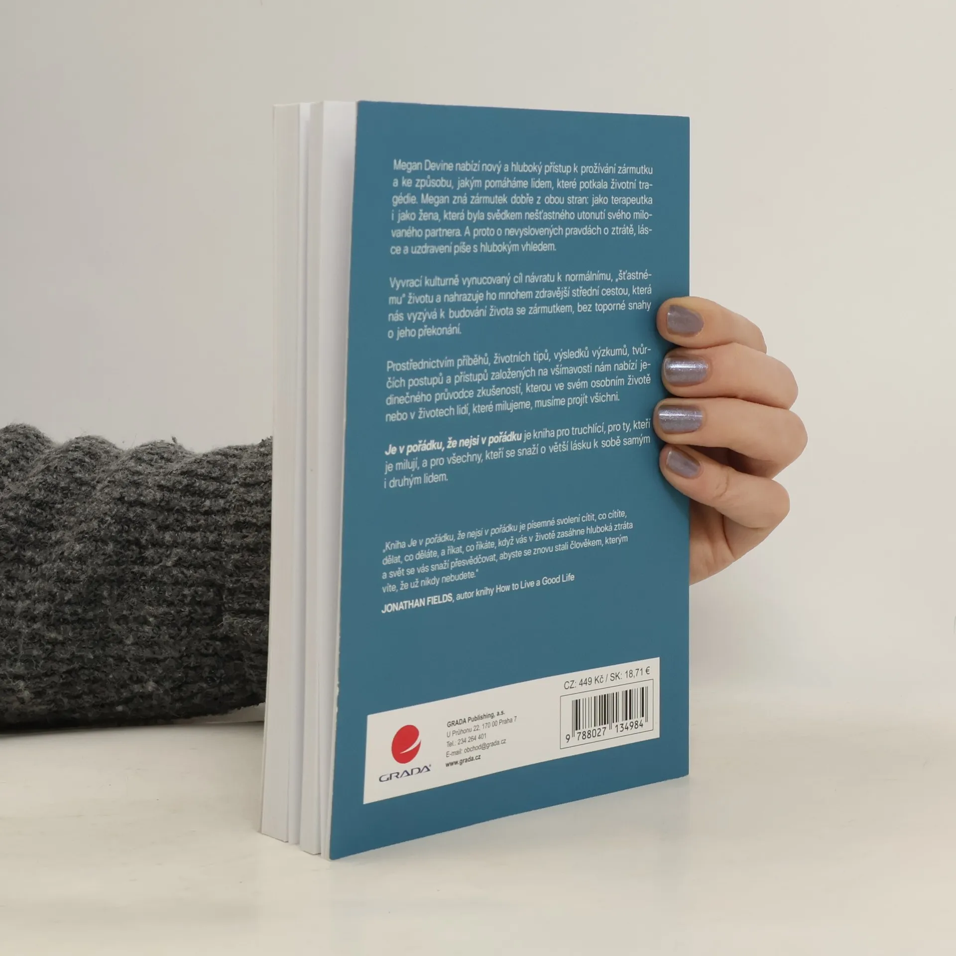 Megan Devine nabízí nový a hluboký přístup k prožívání zármutku a ke způsobu, jakým pomáháme lidem, které potkala životní tragédie. Megan zná zármutek dobře z obou stran: jako terapeutka i jako žena, která byla svědkem nešťastného utonutí svého milovaného partnera. A proto o nevyslovených pravdách o ztrátě, lásce a uzdravení píše s hlubokým vhledem.Vyvrací kulturně vynucovaný cíl návratu k normálnímu, „šťastnému“ životu a nahrazuje ho mnohem zdravější střední cestou, která nás vyzývá k budování života se zármutkem, bez toporné snahy o jeho překonání.Prostřednictvím příběhů, životních tipů, výsledků výzkumů, tvůrčích postupů a přístupů založených na všímavosti nám nabízí jedinečného průvodce zkušeností, kterou ve svém osobním životě nebo v životech lidí, které milujeme, musíme projít všichni.Je v pořádku, že nejsi v pořádku je kniha pro truchlící, pro ty, kteří je milují, a pro všechny, kteří se snaží o větší lásku k sobě samým i druhým lidem.