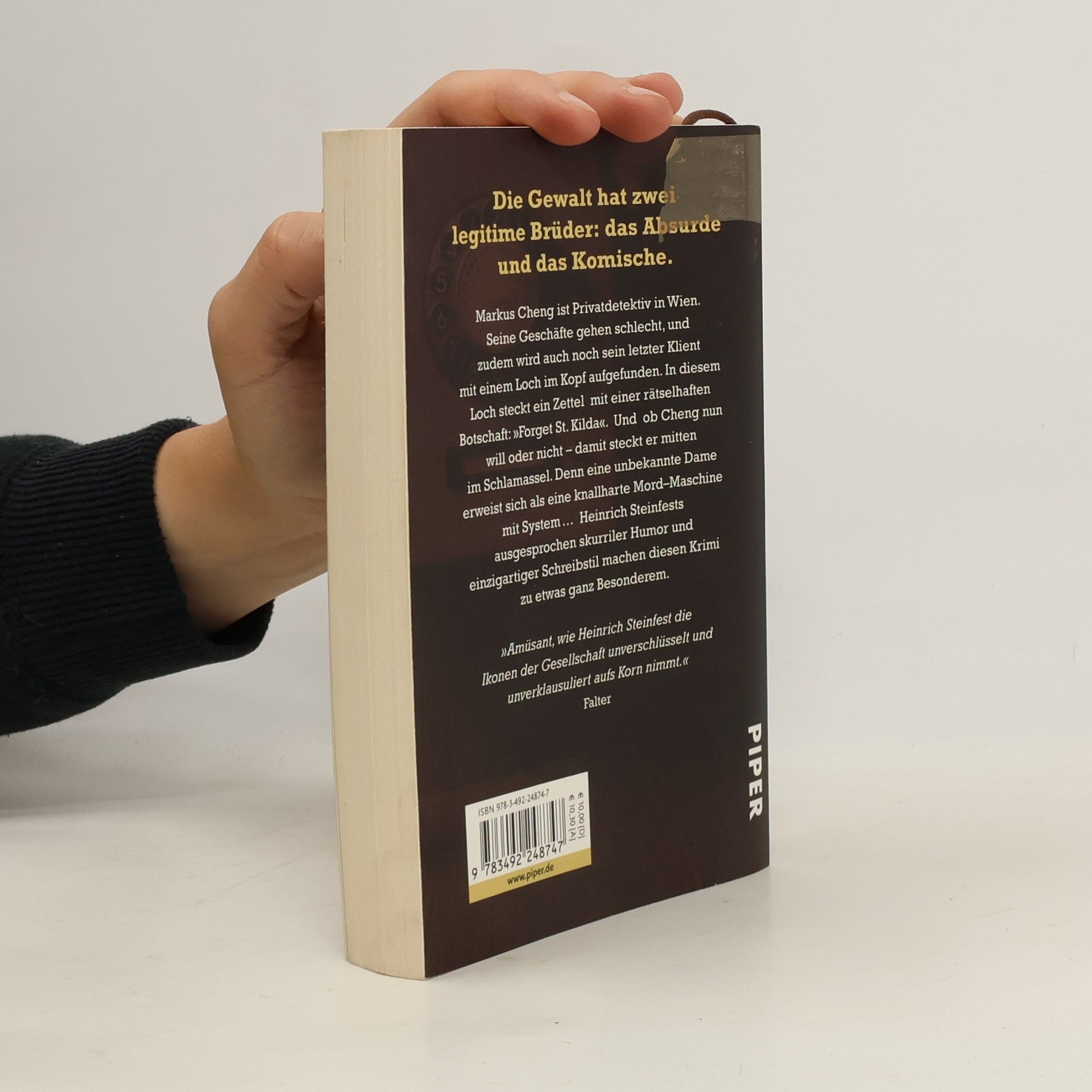 Markus Cheng ist Privatdetektiv in Wien. Seine Geschäfte gehen schlecht, und zudem wird auch noch sein letzter Klient mit einem Loch im Kopf aufgefunden. In diesem Loch steckt ein Zettel mit einer rätselhaften Botschaft: »Forget St. Kilda«. Und ob Cheng nun will oder nicht – damit steckt er mitten im Schlamassel. Denn eine unbekannte Dame erweist sich als eine knallharte Mordmaschine mit System … Heinrich Steinfests ausgesprochen skurriler Humor und einzigartiger Schreibstil machen diesen Krimi zu etwas ganz Besonderem.