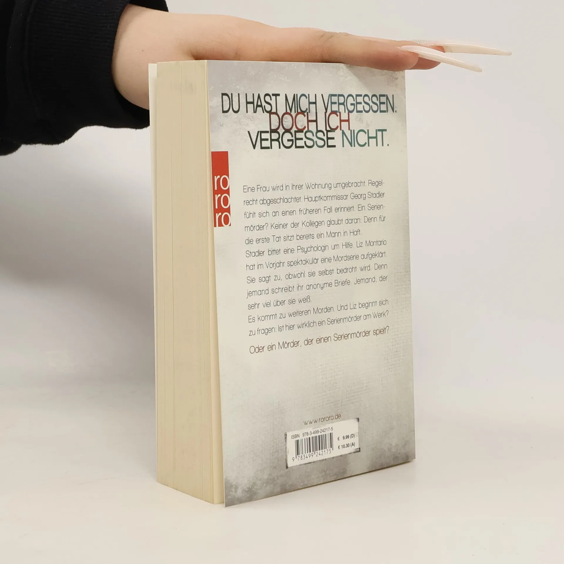 Du hast mich vergessen. Doch ich vergesse nicht. Eine Frau wird in ihrer Wohnung umgebracht. Regelrecht abgeschlachtet. Hauptkommissar Georg Stadler fühlt sich an einen früheren Fall erinnert. Ein Serienmörder? Keiner der Kollegen glaubt daran: Denn für die erste Tat sitzt bereits ein Mann in Haft. Stadler bittet eine Psychologin um Hilfe. Liz Montario hat im Vorjahr spektakulär eine Mordserie aufgeklärt. Sie sagt zu, obwohl sie selbst bedroht wird. Denn jemand schreibt ihr anonyme Briefe. Jemand, der sehr viel über sie weiß. Es kommt zu weiteren Morden. Und Liz beginnt sich zu fragen: Ist hier wirklich ein Serienmörder am Werk? Oder ein Mörder, der einen Serienmörder spielt?