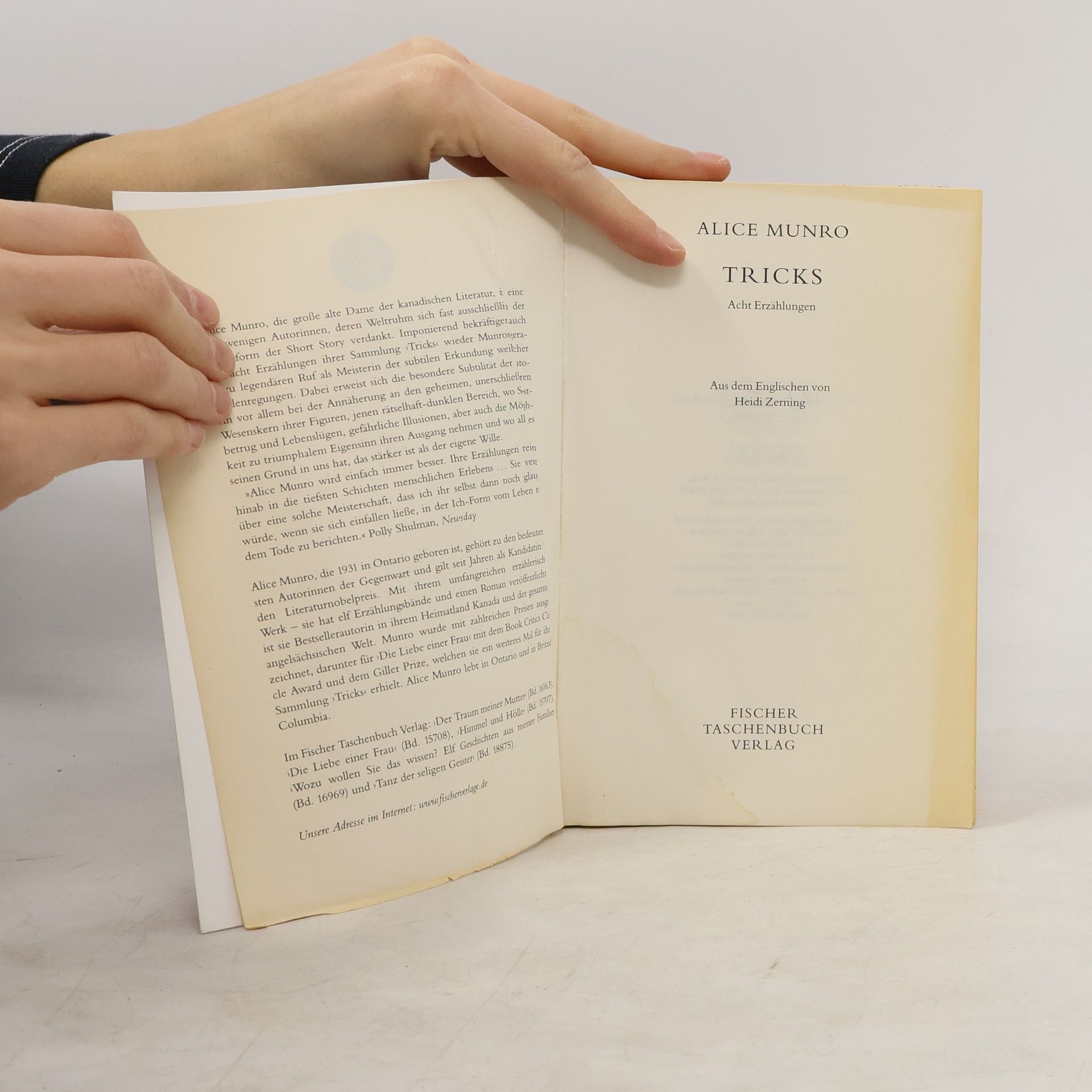 Nobelpreis für Literatur 2013 Tricks, acht meisterliche Erzählungen von Alice Munro: Geschichten über Ausreißer, Entscheidungen, Leidenschaften und Verfehlungen. Wieder beweist Alice Munro besonderes Gespür für das Geheimnis ihrer Figuren, jenen rätselhaften Bereich, wo Selbstbetrug auf Hoffnungen, gefährliche Illusionen auf die kleinen Tricksereien des Alltags treffen. Der Leser kommt in ihren Geschichten seinem eigenen Leben so nah, dass er schwindlig wird vor Herzleid und Glück.