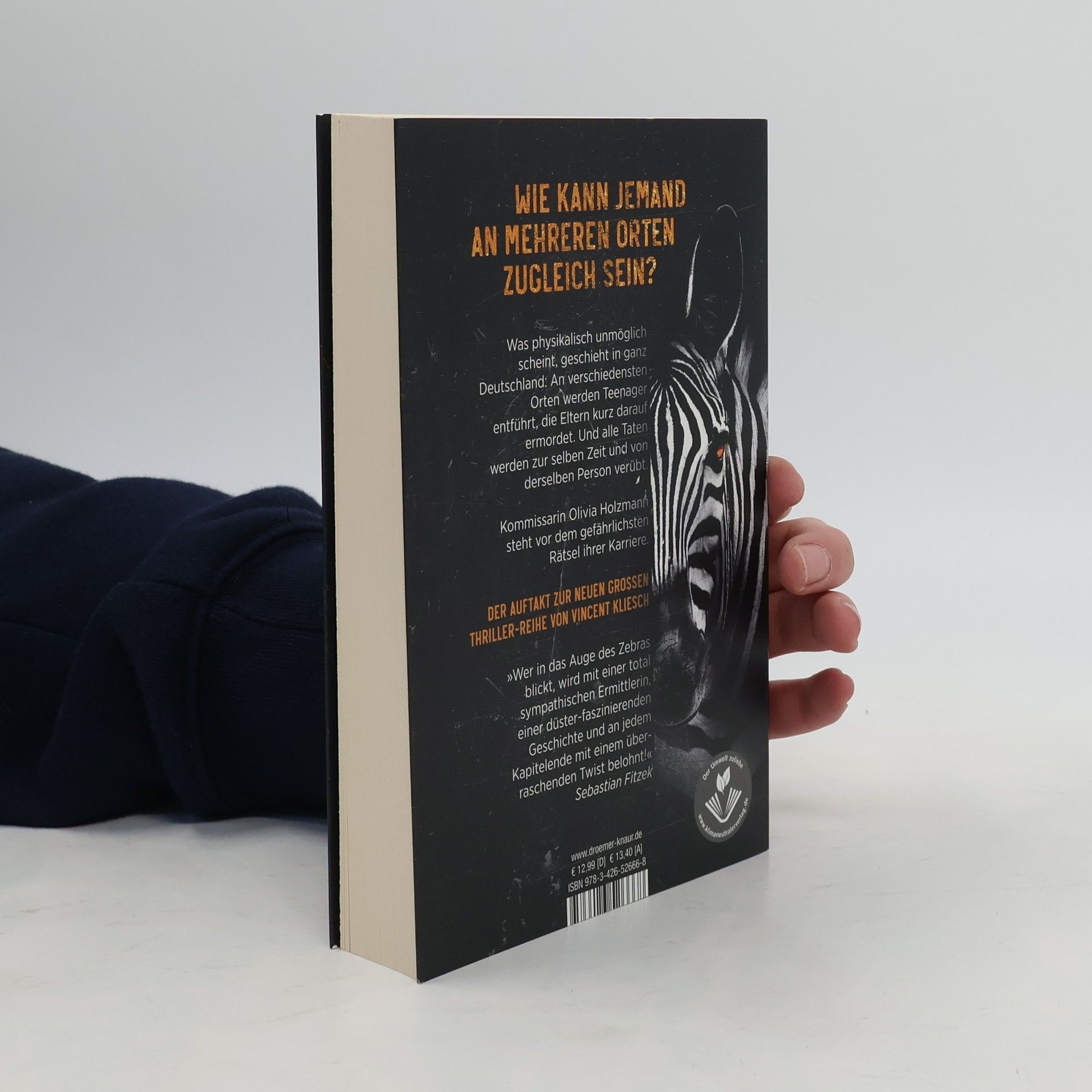 Wer in das Auge des Zebras blickt, wird mit einer sympathischen Ermittlerin, einer düster-faszinierenden Geschichte und überraschenden Twists belohnt! Im Auftakt der Reihe muss Kommissarin Olivia Holzmann einen Fall lösen, der physikalisch unmöglich erscheint. In ganz Deutschland verschwinden Teenager, während ihre Eltern ermordet werden. Alle Beweise deuten darauf hin, dass die Taten zur selben Zeit und von derselben Person begangen wurden. Olivia vom LKA Berlin steht vor einem Rätsel, denn die Zeit drängt für die Jugendlichen. Um diesen übernatürlichen Fall zu knacken, benötigt sie die Fähigkeiten dreier besonderer Ermittler: ihre eigene Willensstärke, die geniale Beobachtungsgabe ihres Mentors Severin Boesherz und die Erfahrung der pensionierten Kommissarin Esther Wardy. Doch sie ahnen nicht, wie leicht der Täter ihnen das Liebste nehmen kann. Ein genialer Psychopath, ein unmöglicher Fall und unvorhersehbare Wendungen erwarten die Leser. Der deutsche Thriller-Autor Vincent Kliesch, bekannt für die Bestsellerreihe "Auris" zusammen mit Sebastian Fitzek, wird mit der neuen Ermittlerin Olivia Holzmann für viele schlaflose Nächte sorgen!