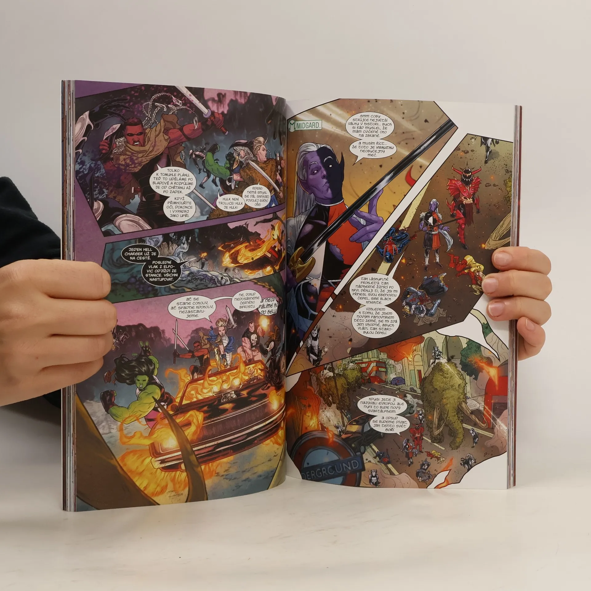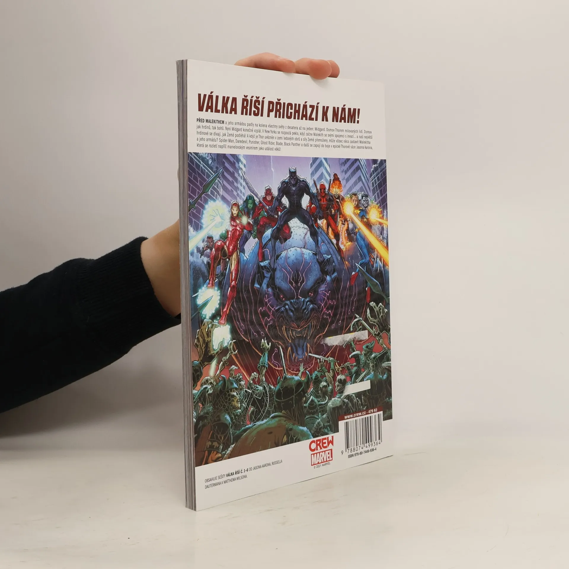 VÁLKA ŘÍŠÍ PŘICHÁZÍ K NÁM! Před Malekithem a jeho armádou padly na kolena všechny světy z desatera až na jeden: Midgard. Domov Thorových milovaných lidí. Domov jak hrdinů, tak bohů. Nyní Midgard konečně vzplál. V New Yorku se rozpoutá peklo, když začne Malekith se svými spojenci s invazí... a naši největší hrdinové se dívají, jak Země podléhá! A když je Thor uvězněn v zemi ledových obrů a síly Země přemoženy, může vůbec něco zastavit Malekitha a jeho armádu? Thor, Spider-Man, Daredevil, Punisher, Ghost Rider, Blade, Black Panther a další se zapojí do boje v epické sáze Jasona Aarona, která se rozletí napříč marvelovským vesmírem jako událost věků! OBSAHUJE SEŠITY VÁLKA ŘÍŠÍ Č. 1–6 OD JASONA AARONA, RUSSELLA DAUTERMANA A MATTHEWA WILSONA.