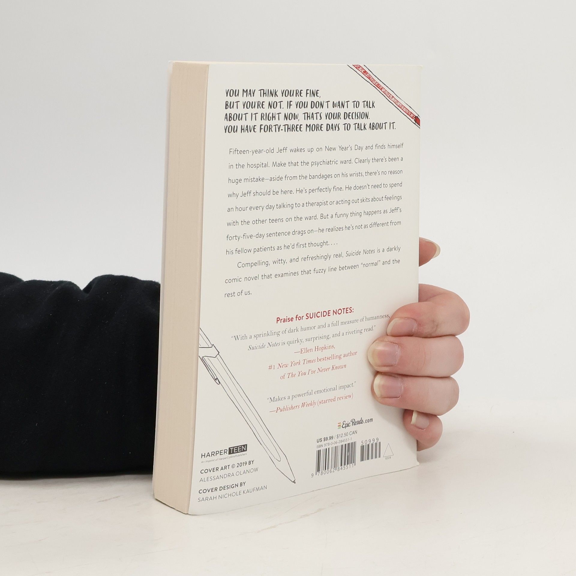 An unforgettable coming of age novel for fans of 13 Reasons Why, It’s Kind of a Funny Story, and The Perks of Being a Wallflower. Fifteen-year-old Jeff wakes up on New Year’s Day to find himself in the hospital—specifically, in the psychiatric ward. Despite the bandages on his wrists, he’s positive this is all some huge mistake. Jeff is perfectly fine, perfectly normal; not like the other kids in the hospital with him. But over the course of the next forty-five days, Jeff begins to understand why he ended up here—and realizes he has more in common with the other kids than he thought. “With a sprinkling of dark humor and a full measure of humanness, Suicide Notes is quirky, surprising, and a riveting read.” —Ellen Hopkins, author of The You I’ve Never Known and Love Lies Beneath “Like the very best teen novels, Suicide Notes is both classic and edgy, timeless and provocative.” —Brent Hartinger, author of Geography Club “Makes a powerful emotional impact.” —Publishers Weekly (starred review) “Jeff’s wit and self-discovery are refreshing, poignant, and, at times, laugh-out-loud funny.” —School Library Journal