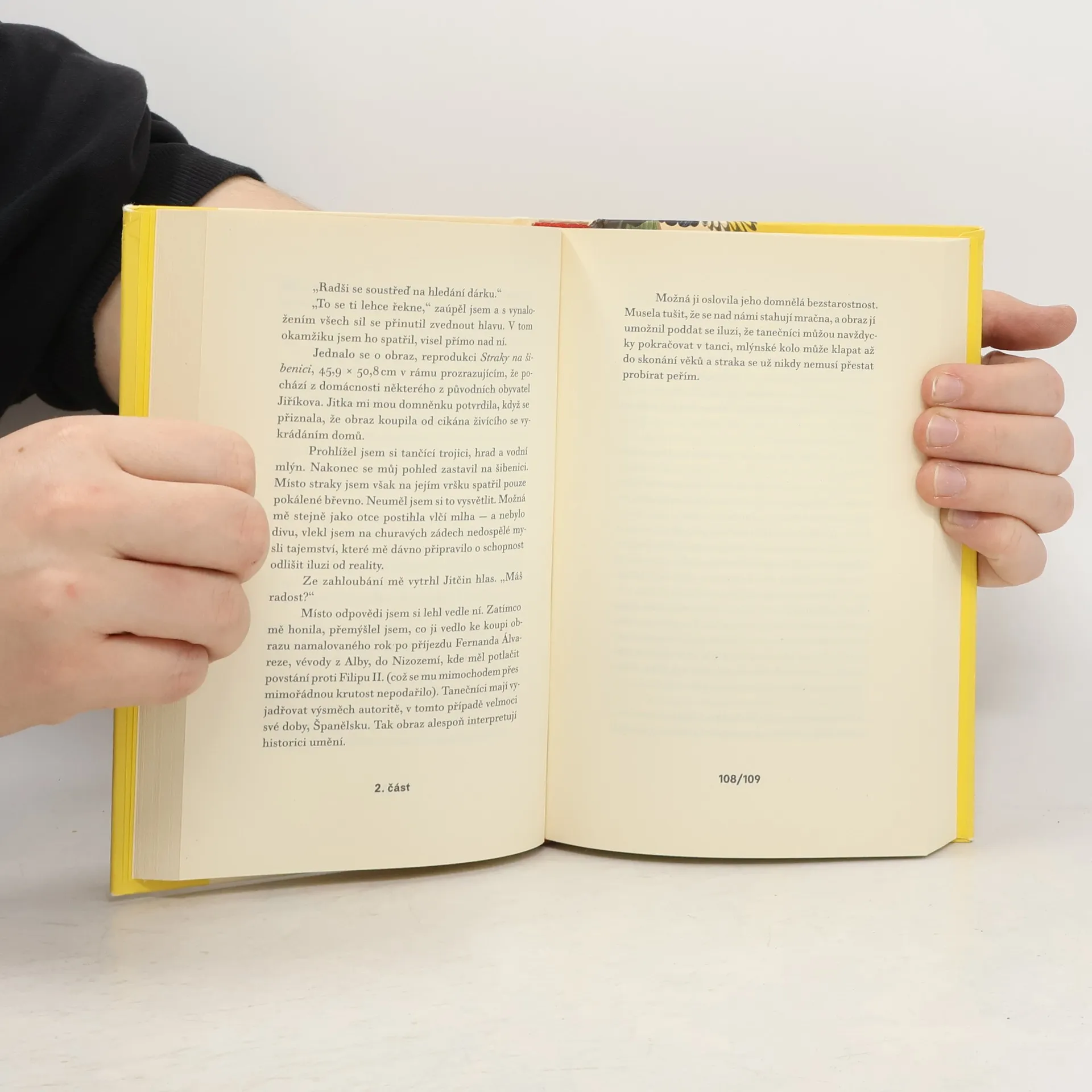 Porozumět vlastnímu životu a najít sám sebe nemusí nutně znamenat výhru. Představme si obraz Pietera Brueghela Straka na šibenici. Dítě na něm vidí především ptáka sedícího na podivné houpačce, dospělý však straku úplně přehlédne, neboť v centru pozornosti u něj stojí šibenice. Hrdina románu žije s otcem alkoholikem v chátrajícím domě na okraji severočeského zapadákova. Přestože se díky své inteligenci naučí číst dřív, než jeho vrstevníci poprvé vkročí do školy, zůstává v důsledku otcovy pokřivené představy o výchově v zajetí téměř středověké nevědomosti plné přízraků a démonů. Od dětství jej pak provází Brueghelův obraz, vracející se v různých situacích jako šifra, kterou je třeba vyluštit. V dospělosti opouští manželku i právě narozenou dceru a jen o vlásek unikne vězení za daňové úniky. Stejně jako jeho otec tráví celé dny opilý na gauči a jediné, co jej zajímá, je důvod, proč kdysi zmizela jeho matka. Nakonec se vrací do vesnice, v níž strávil dětství, a skrze zvláštní setkání dospěje k poznání, že nalezení sebe sama vyžaduje oběť.