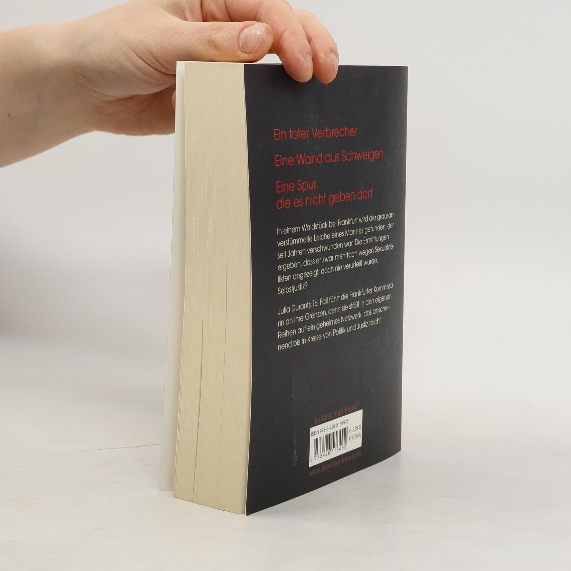 In einem Waldstück bei Frankfurt wird die Leiche eines Sexualstraftäters gefunden, der seit Jahren als vermisst galt. Die Ermittlungen ergeben, dass der Mann zwar mehrfach verdächtigt, doch nie verurteilt wurde. In den Akten tauchen immer wieder derselbe Richter und dieselben Anwälte auf – Zufall? Die brutalen Verletzungen des Mordopfers lassen auf ein sehr persönliches Motiv schließen. Und auf große Wut. Und während Julia Durant sich noch mit der Frage herumschlägt, wem sie hier eigentlich zu Gerechtigkeit verhilft, muss sie erkennen, dass ihr der Gegenwind auch aus den eigenen Reihen entgegenschlägt.
