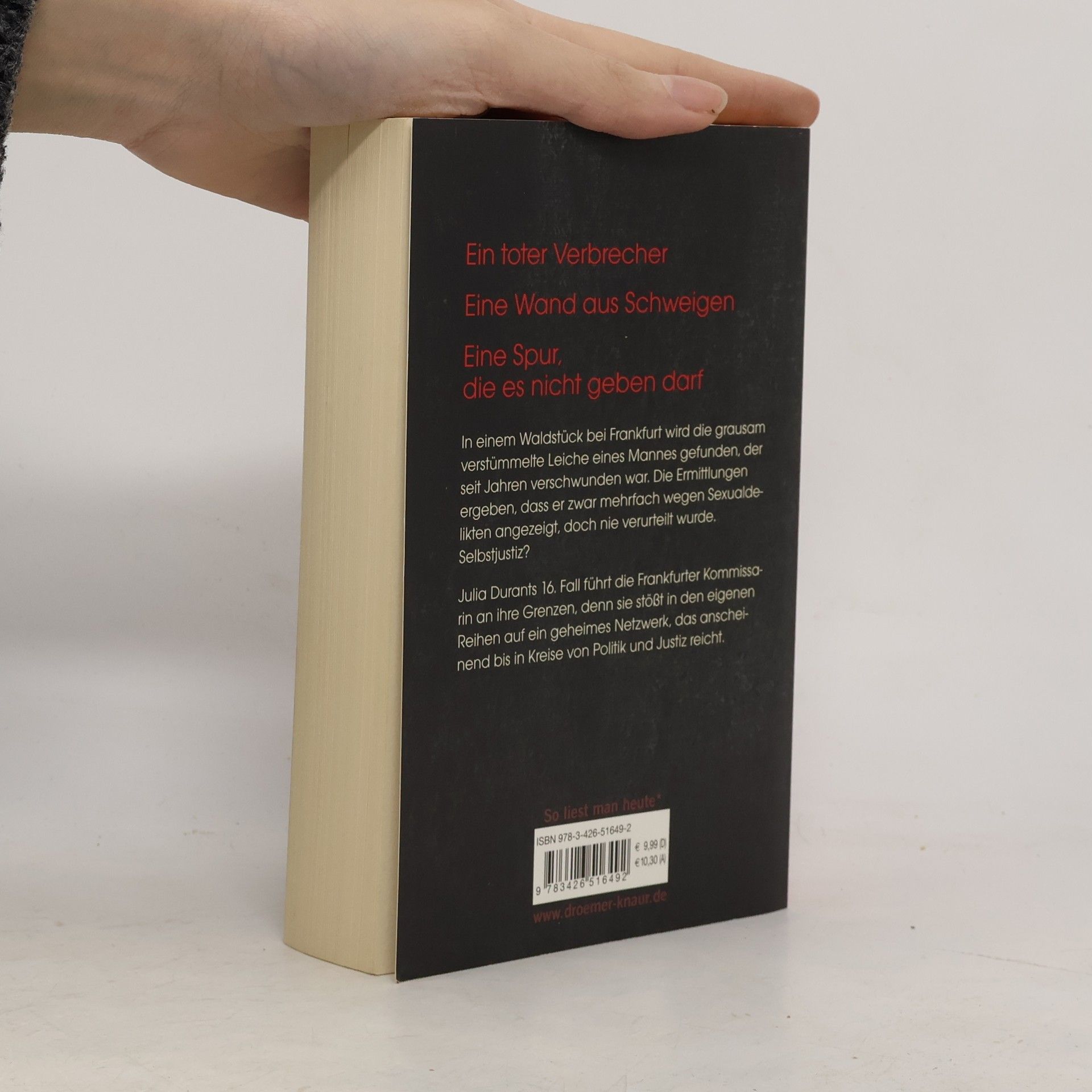 In einem Waldstück bei Frankfurt wird die Leiche eines Sexualstraftäters gefunden, der seit Jahren als vermisst galt. Die Ermittlungen ergeben, dass der Mann zwar mehrfach verdächtigt, doch nie verurteilt wurde. In den Akten tauchen immer wieder derselbe Richter und dieselben Anwälte auf – Zufall? Die brutalen Verletzungen des Mordopfers lassen auf ein sehr persönliches Motiv schließen. Und auf große Wut. Und während Julia Durant sich noch mit der Frage herumschlägt, wem sie hier eigentlich zu Gerechtigkeit verhilft, muss sie erkennen, dass ihr der Gegenwind auch aus den eigenen Reihen entgegenschlägt.