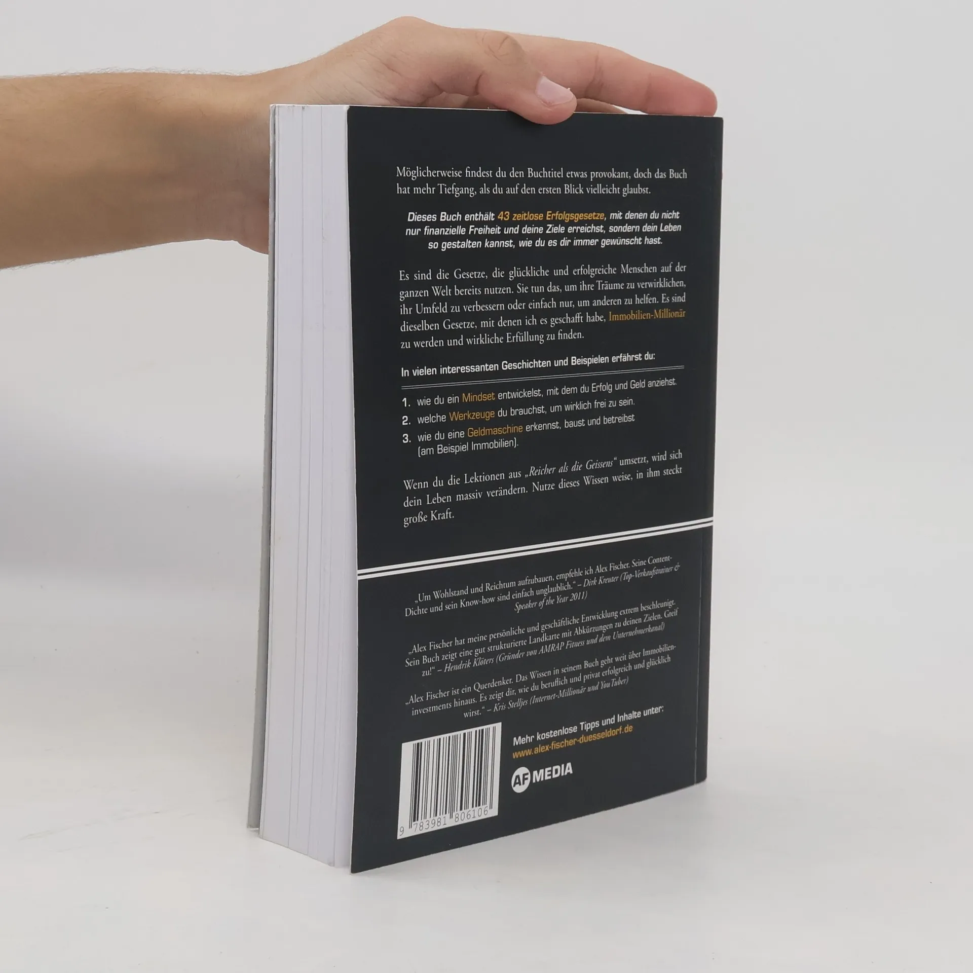 Reicher als die Geissens ist das erste und einzige Wohlstands-Lehrbuch weltweit, das die 43 wichtigsten Erfolgs-Fundamente Schritt für Schritt so inspirierend erarbeitet, dass du dich auch ohne Startkapital in 5 Jahren zum Immobilienmillionär transformieren kannst. Es enthält zeitlose Erfolgsgesetze, die dir helfen, finanzielle Freiheit zu erreichen und dein Leben nach deinen Wünschen zu gestalten. Diese Gesetze werden bereits von glücklichen und erfolgreichen Menschen genutzt, um ihre Träume zu verwirklichen und anderen zu helfen. In vielen Geschichten und anschaulichen Beispielen erfährst du unter anderem: - Wie du in fünf Jahren ohne Startkapital zum Immobilien-Millionär wirst. - Wie du die 43 Erfolgsgesetze verinnerlichst und ein Leben nach deinen Vorstellungen führst. - Wie du ein wandelnder Geldmagnet wirst, indem du die geheimen Geldgesetze befolgst. - Wie du ein einflussreiches Power-Netzwerk aufbaust und Celebrities sowie Influencer anziehst. - Wie du deine Stärken entdeckst und deine Berufung erkennst, um ein glückliches Leben zu führen. - Wie du schnell Eigenkapital und Cashflow generierst und passives Einkommen aufbaust. - Wie du Kapital, Zeit und Ressourcen optimal hebelst, um maximale Wirkung zu erzielen. Setze die Lektionen und über 668 Tipps um, und erlebe eine massive Veränderung in deinem Leben. Nutze dieses Wissen weise, denn es birgt große Kraft.