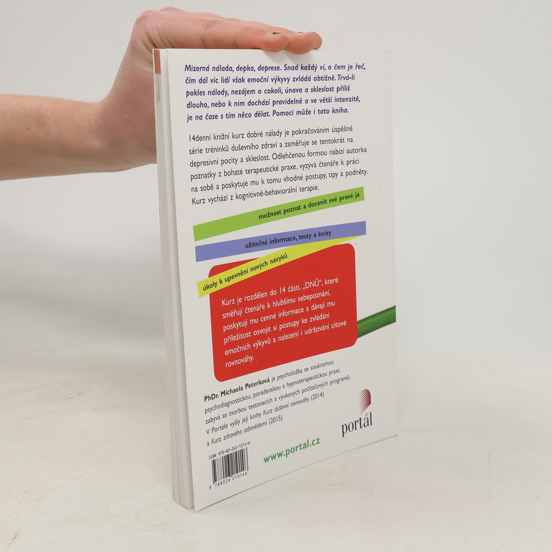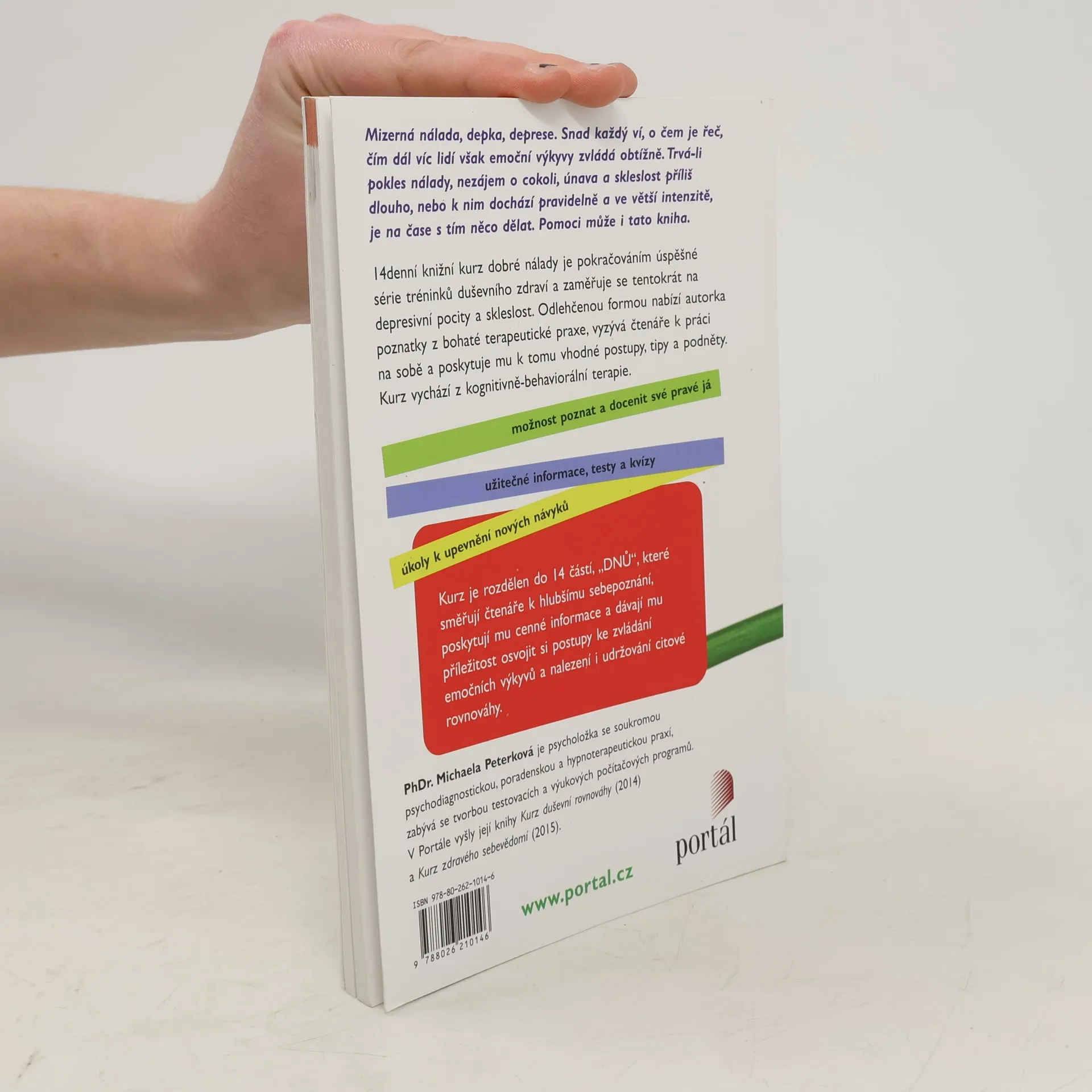 Mizerná nálada, „depka“, deprese. Snad každý ví, o čem je řeč, čím dál víc lidí však emoční výkyvy zvládá obtížně. Trvá-li pokles nálady, nezájem o cokoli, únava a skleslost příliš dlouho nebo k němu dochází pravidelně a ve větší intenzitě, je na čase s tím něco dělat. Pomoci může i tato kniha. 14denní knižní kurz dobré nálady je pokračováním série tréninků duševního zdraví a zaměřuje se tentokrát na depresivní pocity a skleslost. Odlehčenou formou nabízí autorka poznatky z bohaté terapeutické praxe, vyzývá čtenáře k práci na sobě a poskytuje mu k tomu vhodné postupy, tipy a podněty. Kurz vychází z kognitivně-behaviorální terapie. Kurz je rozdělen do 14 částí, „DNŮ“, které směřují čtenáře k hlubšímu sebepoznání, poskytují mu cenné informace a dávají mu příležitost osvojit si postupy ke zvládání emočních výkyvů, nalezení a udržování citové rovnováhy. PhDr. Michaela Peterková je psycholožka se soukromou psychodiagnostickou, poradenskou a hypnoterapeutickou praxí, zabývá se tvorbou testovacích a výukových počítačových programů. Je autorkou knih Kurz duševní rovnováhy (Portál, 2014) a Kurz zdravého sebevědomí (2015).