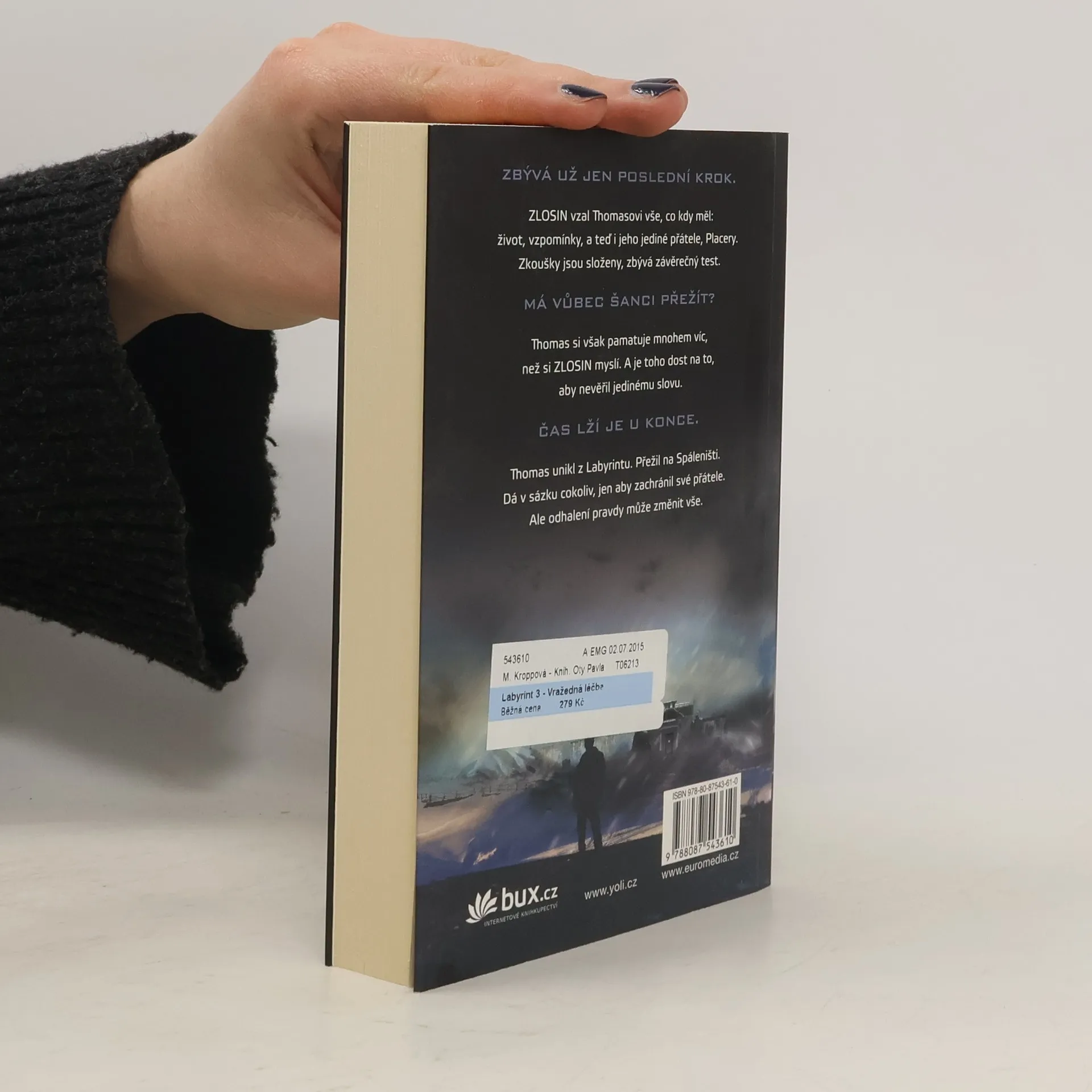 Konec řady se blíží. ZLOSIN vzal Thomasovi vše. Ale je to konečně za nimi. Zkoušky jsou po posledním testu kompletní. Přežijí? Co ZLOSIN neví, je to, že Thomas si pamatuje mnohem víc, než si myslí. A je toho dost, aby věděl, že nemůže věřit ani slovu z toho, co jim říkají. Pravda bude děsivá. Thomas porazil bludiště. Přežil Spáleniště. A nyní bude riskovat cokoliv, aby zachránil své přátele. Ale pravdou je, že by to mohlo být to poslední, co udělá a čím všechno skončí. Čas lží je u konce . Dotisk v roku 2018 se stejným ISBN a pouze jinou - filmovou obálkou.