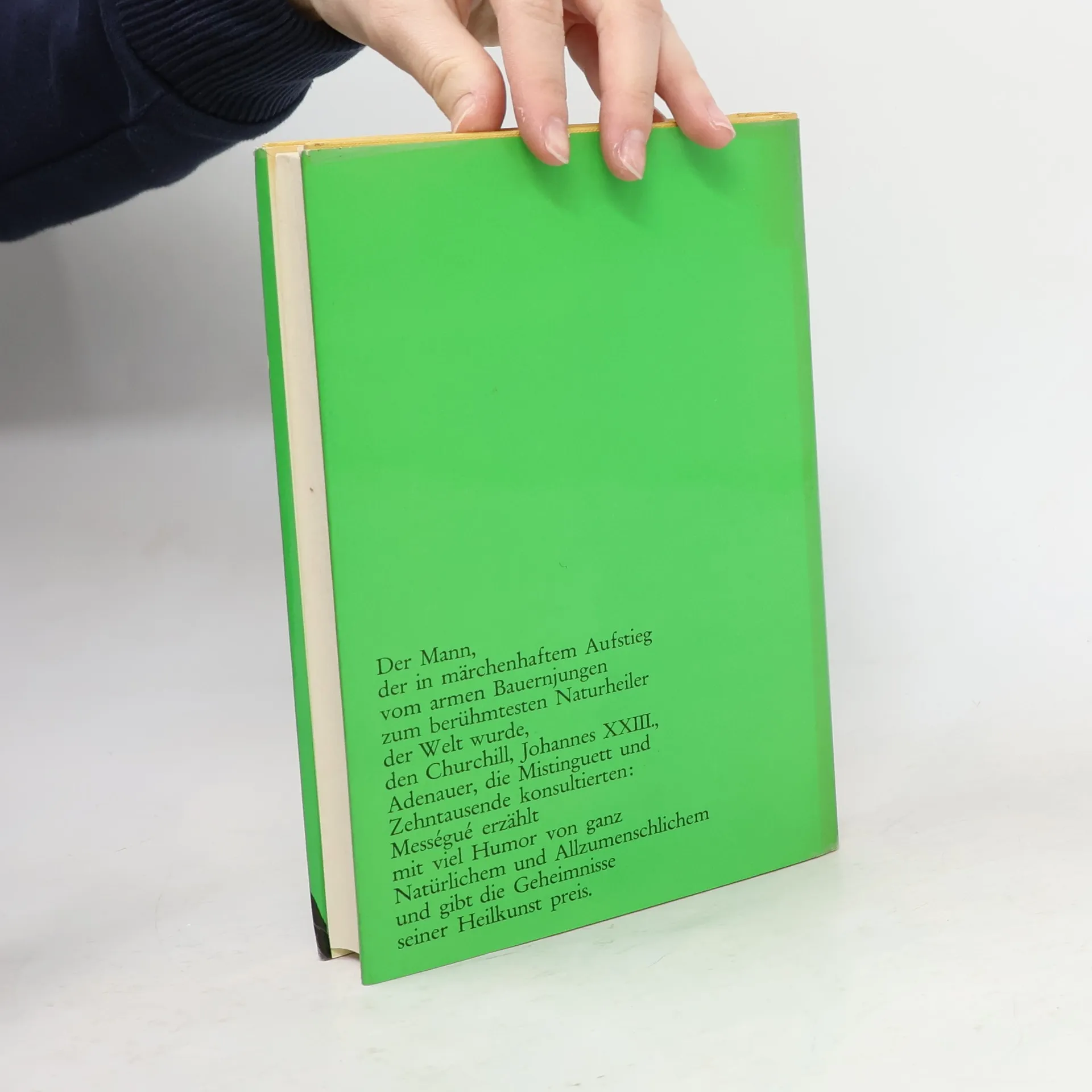 Mességué: der Mann der in märchenhaftem Aufstieg vom armen Bauernjungen zum berühmtesten Naturheiler der Welt wurde ... Er hat in seinem Leben mehr als 250'000 Menschen behandelt. Heute besitzt er ein grosses Industrieunternehmen ... Er ist Bürgermeister der südfranzösischen Stadt Fleurance ... (Klappentext).