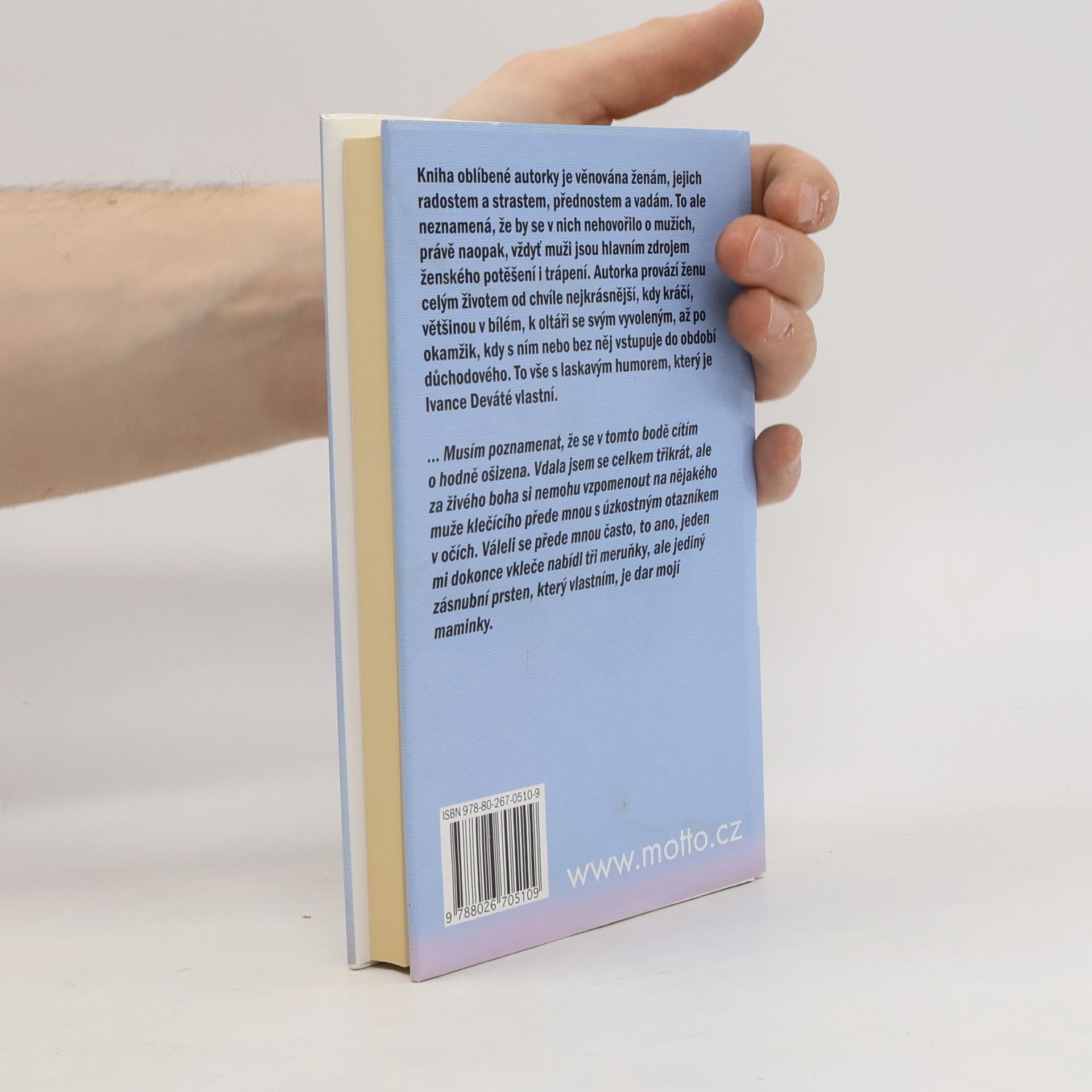 Kniha oblíbené autorky je věnována ženám, jejich radostem a strastem, přednostem a vadám. Autorka provází ženu celým životem od chvíle nejkrásnější, kdy kráčí, většinou v bílém, k oltáři se svým vyvoleným, až po okamžik, kdy s ním nebo bez něj vstupuje do období důchodového.