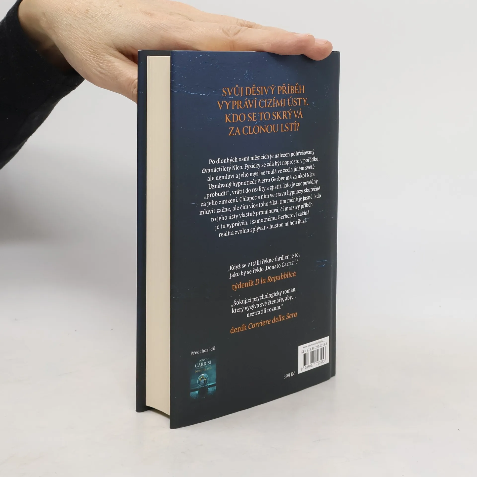 Psychologický thriller s detektivní zápletkou představuje druhý případ, na jehož šetření spolupracuje psycholog Pietro Gerber. Dvanáctiletý chlapec, který byl osm měsíců nezvěstný, se náhle objeví, a z jeho příběhu mrazí. V lese Pekelného údolí je nalezen zmizelý chlapec, když už v to nikdo nedoufal. Nicovi je dvanáct let a zdá se, že je v pořádku: někdo ho krmil, šatil, staral se o něj. Ale není možné zjistit, kdo to byl, protože Nico nemluví. Jeho vědomí je jako potemnělý dům, do něhož zdánlivě nelze proniknout. Jediný, kdo by ho dokázal probudit, je uspávač dětí. Pietro Gerber, nejlepší hypnotizér ve Florencii, je povolán, aby prozkoumal Nicovu mysl a zjistil, co se mu stalo. A jakkoli se to zdá nemožné, Gerber to zvládne. Podaří se mu odhalit spouštěč, který v Nicovi cosi uvede do chodu. Jenže když chlapcův hlas začne vyprávět příběh, Pietro Gerber pozná, že otevřel dveře zapomenutého pokoje. Chápe, že mu na záchranu Nica nezbývá moc času, a brzy se ocitne uvězněný ve spleti iluzí a lstí. Protože zhypnotizovaný hlas patří tomu chlapci. Ale příběh, který vypráví, je někoho jiného. Nakladatelská anotace.