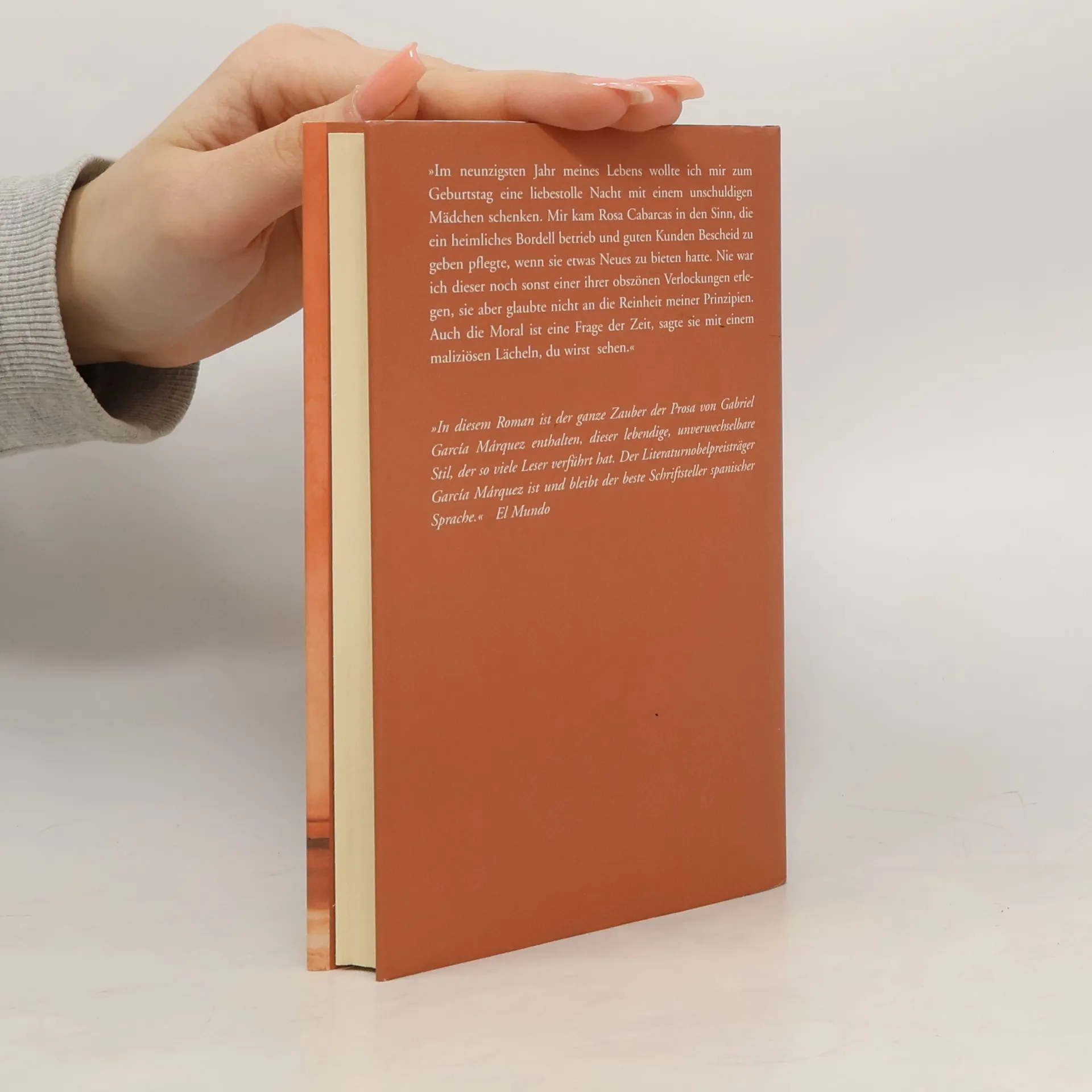 In seinem neuen Roman erzählt Gabriel García Márquez von Liebe, Alter und dem Sinn des Lebens. An seinem 90. Geburtstag gönnt sich ein alter Mann, der sein Leben lang käufliche Liebe erlebte, eine Nacht mit einer Jungfrau in einem Bordell. In dieser Nacht empfindet er zum ersten Mal in seinem Leben echte Liebe, während er die schlafende Schöne betrachtet. Frauen spielten stets eine zentrale Rolle in seinem Leben: seine gebildete Mutter, die ihm Musik und Literatur näherbrachte; seine Verlobte, die er verließ; die zahlreichen Prostituierten, die er nach Preis und nicht nach Reiz wählte; und schließlich Rosa Cabarcas, die ihm Delgadina, ein wunderschönes, schlafendes Mädchen, vorstellt. Diese Begegnung weckt in dem einsamen Mann, der mit dem Leben abgeschlossen hat, unerwartete Gefühle. Er fühlt sich zu Delgadina hingezogen, weckt sie jedoch nie. Ihre Anwesenheit hilft ihm, sich selbst besser zu verstehen und inspiriert ihn zu leidenschaftlichen Liebeserklärungen in der Lokalzeitung. Nach einem Jahr hat sich sein Leben grundlegend verändert. Der Roman ist voller Melancholie, Humor, Klugheit und Zärtlichkeit und variiert meisterhaft das große Thema der Weltliteratur: der alte Mann und das Mädchen. Es ist eine Hommage an den japanischen Nobelpreisträger Yasunari Kawabata.