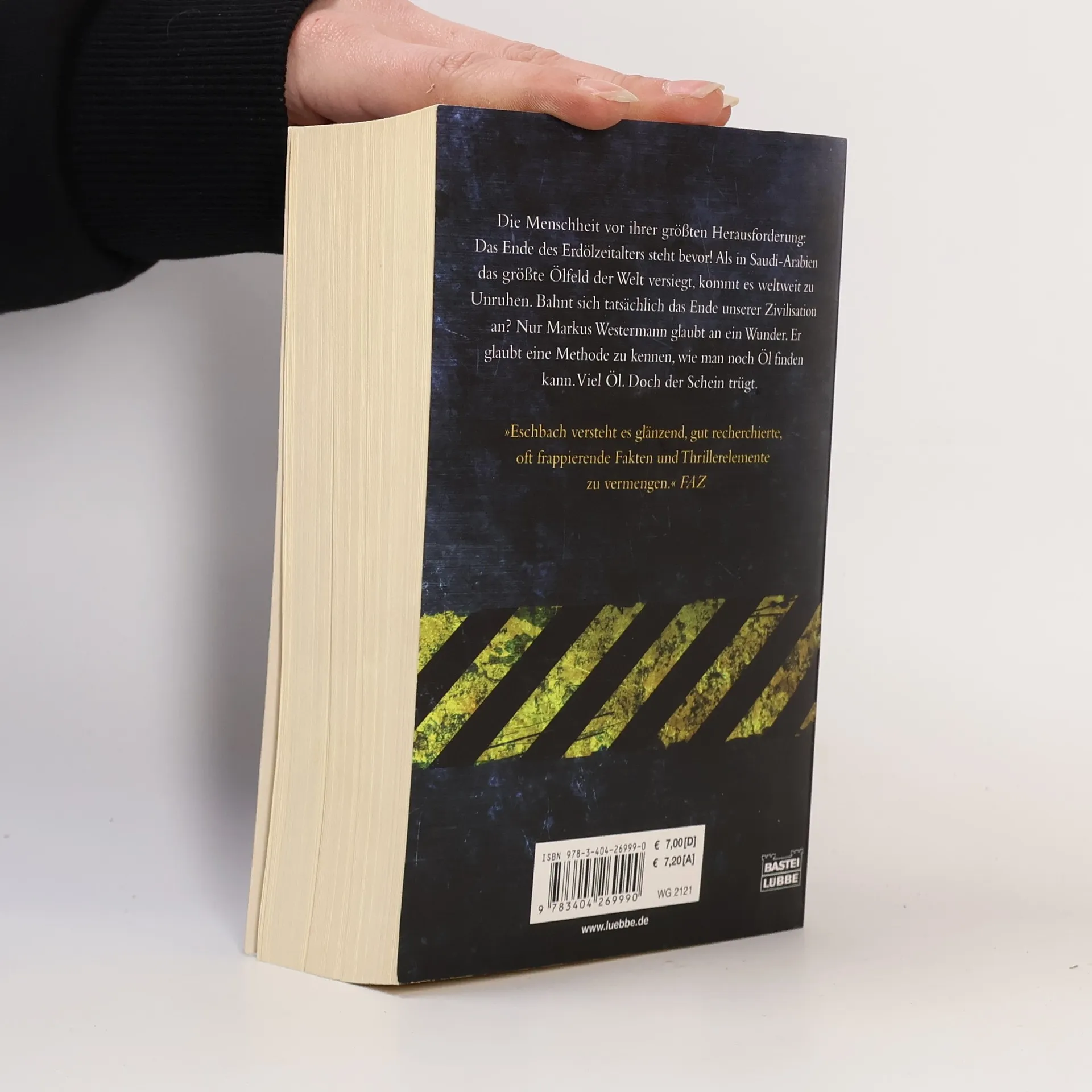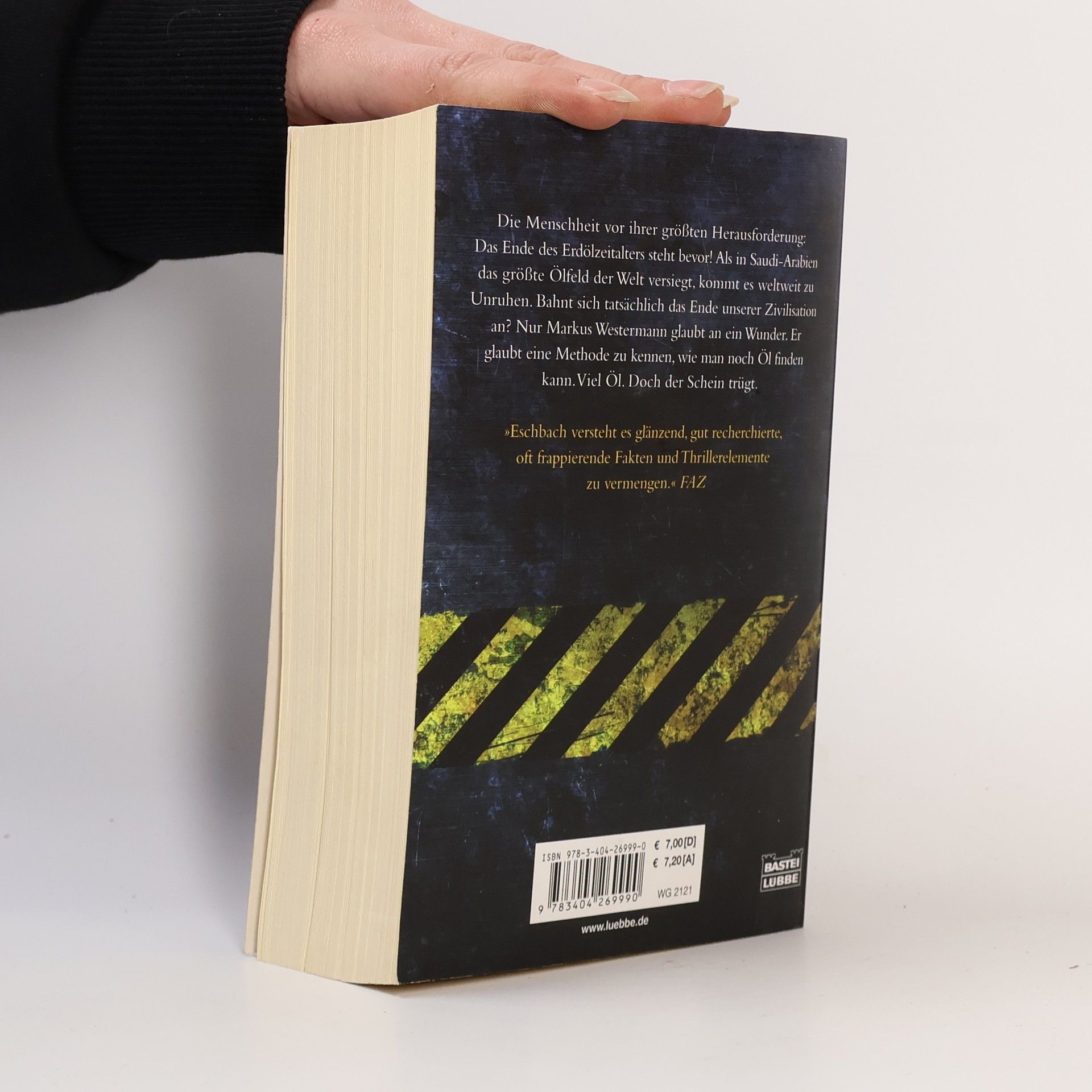 Stellen Sie sich vor, der Liter Superbenzin würde über 4 Euro kosten. Ein Albtraum? Ja. Bloß wäre es erst der Anfang. Denn das Ölzeitalter wird nicht erst mit dem letzten Barrel enden. Es endet, sobald mehr verbraucht wird, als gefördert werden kann. Und dieser Moment ist näher, als die meisten ahnen. Das Problem: Niemand hat einen Plan für die Zeit danach. Auch Markus Westermann weiß von all dem nichts, als er es endlich in die USA geschafft hat und mit seiner Karriere voll durchstarten will. Als er Karl Walter Block kennen lernt, sieht er seine Chance gekommen. Der alte Öltechniker behauptet, dass in den Tiefen der Erde noch genug Öl für die nächsten tausend Jahre schlummert - und dass nur er die Methode kennt, wie man es findet. Er braucht nur noch einen kompetenten Geschäftspartner. Jemanden wie Markus. Nur allzu bereitwillig glaubt die Welt den Versprechungen des Duos. Nach ersten Erfolgen ist gar von einer Renaissance des Ölzeitalters die Rede. Doch der Schein trügt. Als in Saudi-Arabien das größte Ölfeld der Welt versiegt und die Saudis alles daransetzen, die erschreckende Wahrheit zu vertuschen, kommt es nicht nur im Nahen Osten zu Unruhen. Die Menschheit steht plötzlich vor ihrer größten Herausforderung. Das Ende der Welt, wie wir sie kennen, bahnt sich an. Einzig Markus ist überzeugt, das Ruder noch einmal herumreißen zu können