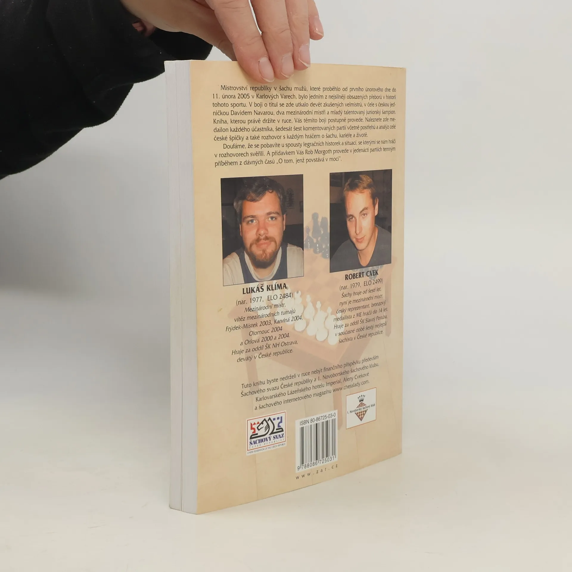 Kniha přibližuje průběh Mistrovství ČR v šachu mužů 2005 v Karlových Varech. Autoři , mezinárodní mistři Klíma a Cvek , se ho sami zúčastnili v pozici hráčů bojujících o titul. Seznámí nás nejenom se zvláštním prostředím šachového turnaje , ale představí nám i všechny účastníky mistrovství. Dozvíme se , kdo byl favoritem na titul , kdo ho opravdu získal a také něco ze soukromí šachových hvězd . Nejvtipnější jsou soukromé postřehy obou autorů z organizace turnaje a jeho průběhu. Pro opravdové znalce hry je kniha opatřena rozbory jednotlivých partií a bohatou fotodokumentací.