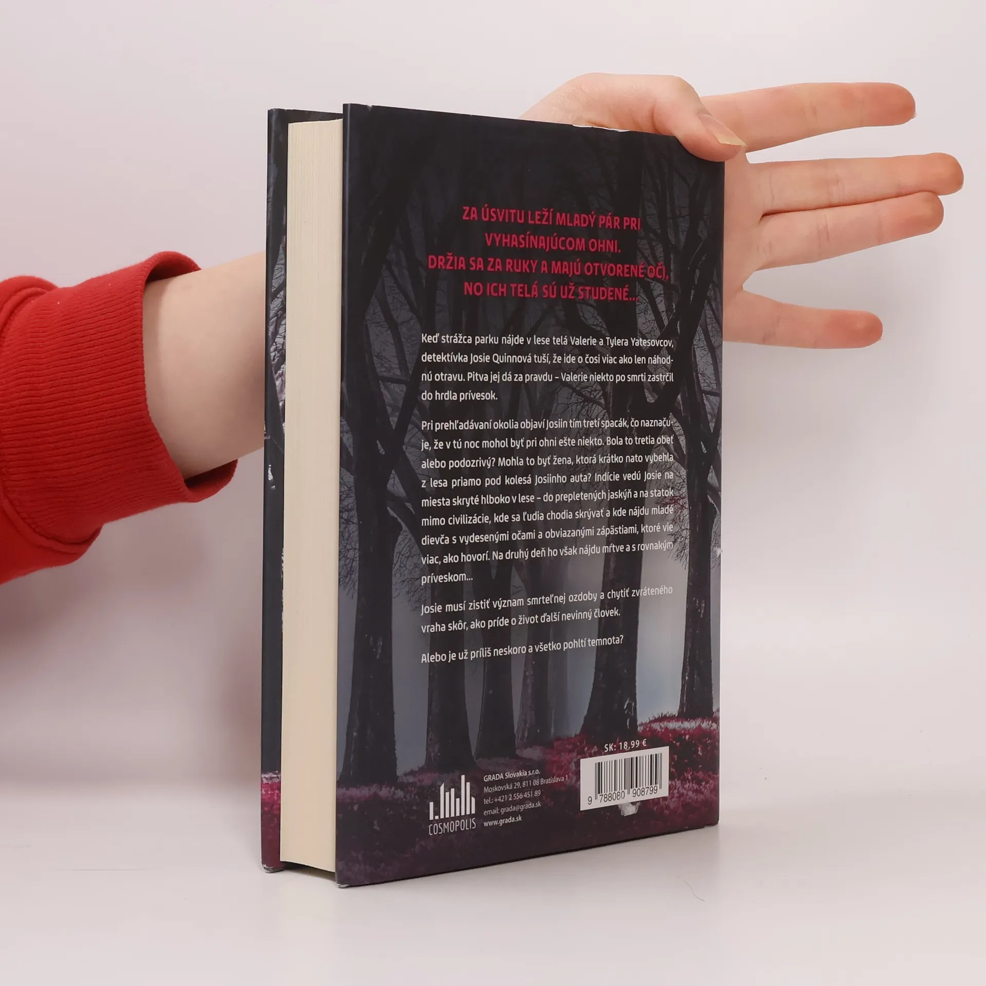 Keď strážca parku nájde v lese telá Valerie a Tylera Yatesovcov, detektívka Josie Quinnová tuší, že ide o čosi viac ako len náhodnú otravu. Pitva jej dá za pravdu – Valerie niekto po smrti zastrčil do hrdla prívesok. Pri prehľadávaní okolia objaví Josiin tím tretí spacák, čo naznačuje, že v tú noc mohol byť pri ohni ešte niekto. Bola to tretia obeť alebo podozrivý? Mohla to byť žena, ktorá krátko nato vybehla z lesa priamo pod kolesá Josiinho auta? Indície vedú Josie na miesta skryté hlboko v lese – do prepletených jaskýň a na statok mimo civilizácie, kde sa ľudia chodia skrývať a kde nájdu mladé dievča s vydesenými očami a obviazanými zápästiami, ktoré vie viac, ako hovorí. Na druhý deň ho však nájdu mŕtve a s rovnakým príveskom... Josie musí zistiť význam smrteľnej ozdoby a chytiť zvráteného vraha skôr, ako príde o život ďalší nevinný človek. Alebo je už príliš neskoro a všetko pohltí temnota?
