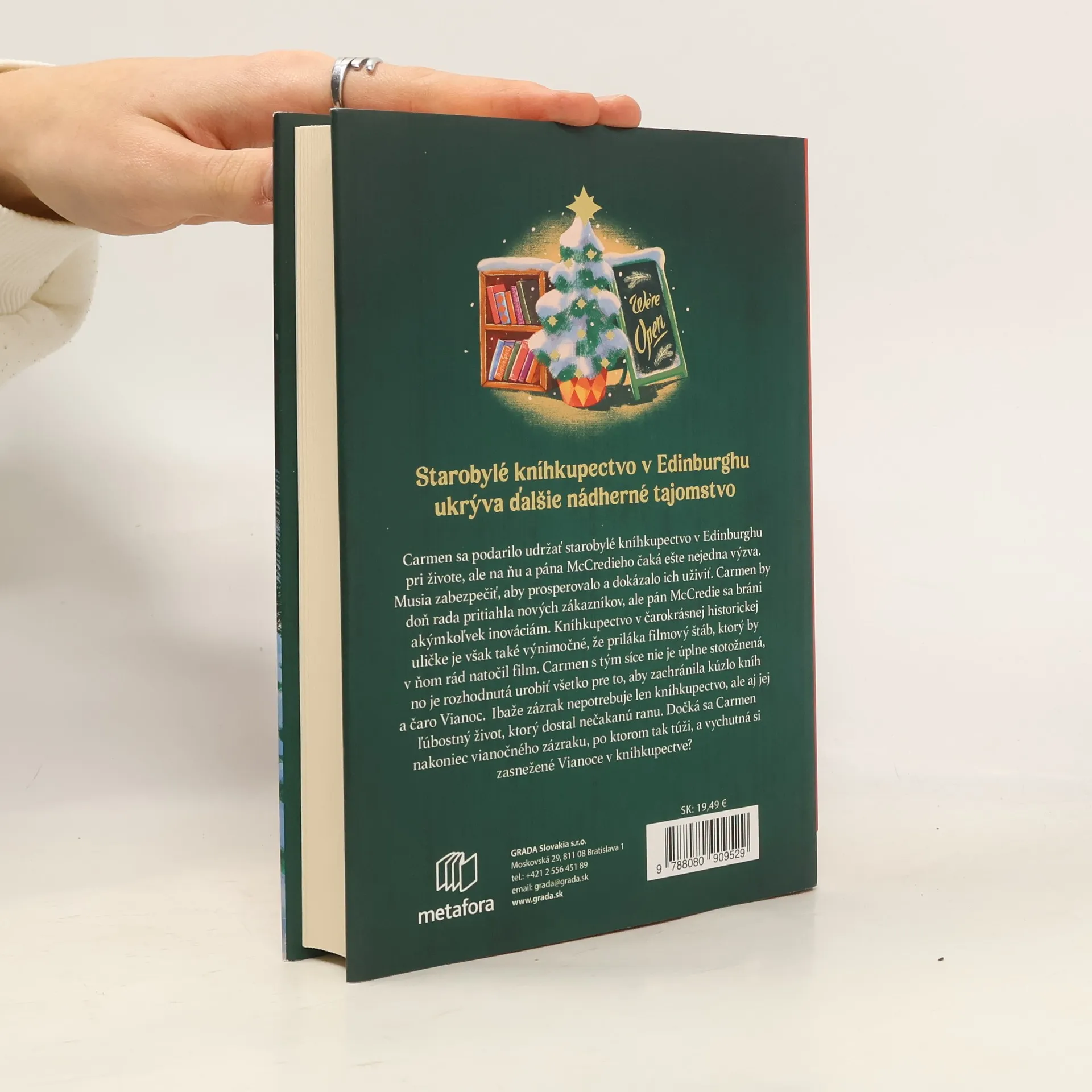 Starobylé kníhkupectvo v Edinburghu ukrýva ďalšie nádherné tajomstvo. Carmen sa podarilo udržať starobylé kníhkupectvo v Edinburghu pri živote, ale na ňu a pána McCredieho čaká ešte nejedna výzva. Musia zabezpečiť, aby prosperovalo a dokázalo ich uživiť. Carmen by doň rada pritiahla nových zákazníkov, ale pán McCredie sa bráni akýmkoľvek inováciám. Kníhkupectvo v čarokrásnej historickej uličke je však natoľko výnimočné, že priláka filmový štáb, ktorý by v ňom rád natočil film. Carmen s tým síce nie je úplne stotožnená, no je rozhodnutá urobiť všetko pre to, aby zachránila kúzlo kníh a čaro Vianoc. Ibaže zázrak nepotrebuje len kníhkupectvo, ale aj jej ľúbostný život, ktorý dostal nečakanú ranu. Dočká sa Carmen nakoniec vianočného zázraku, po ktorom tak túži, a vychutná si zasnežené Vianoce v kníhkupectve?