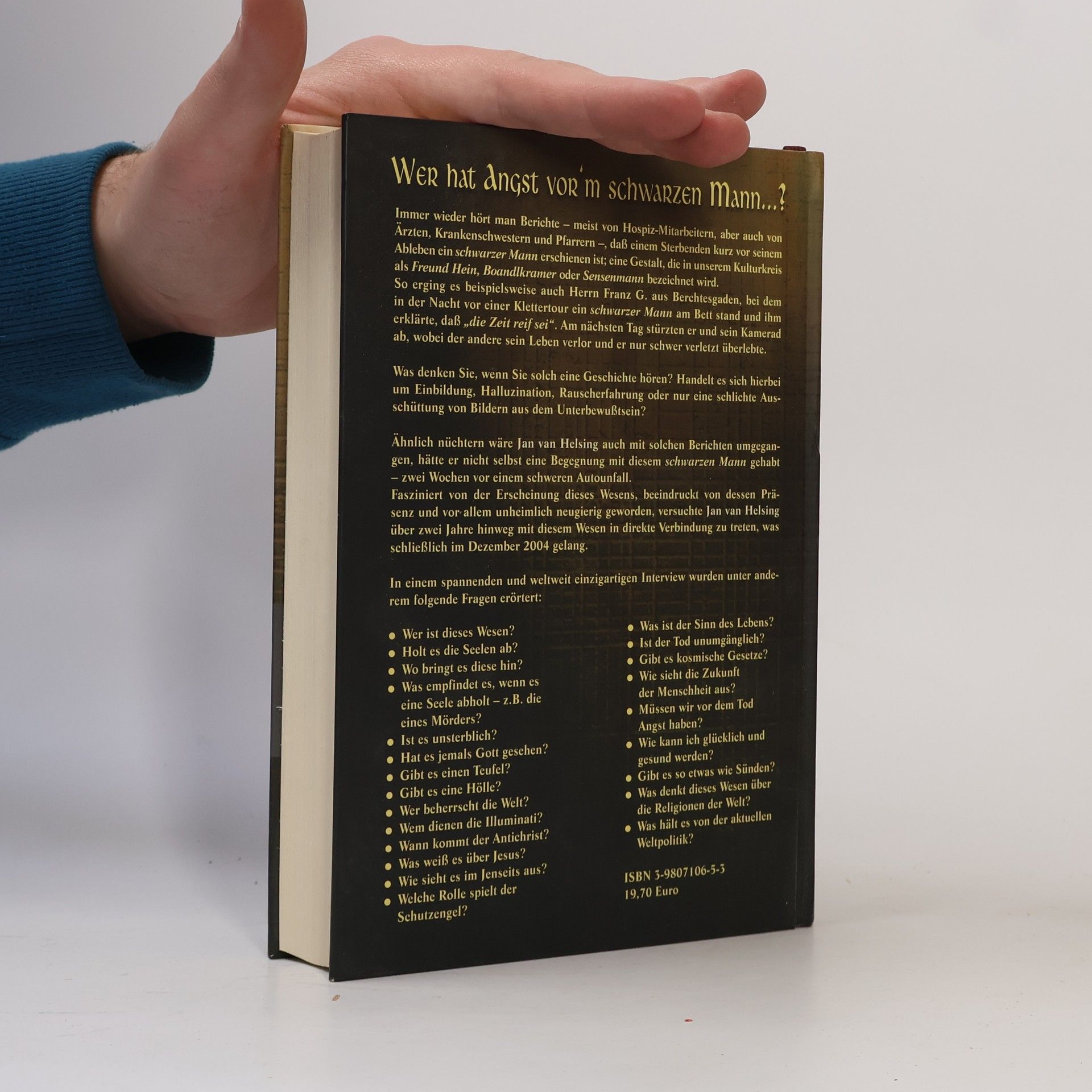 Immer wieder hört man Berichte - meist von Hospiz-Mitarbeitern, aber auch von Ärzten, Krankenschwestern und Pfarrern -, daß einem Sterbenden kurz vor seinem Ableben ein \"schwarzer Mann\" erschienen ist; eine Gestalt, die in unserem Kulturkreis als \"Freund Hein\", \"Boandlkramer\" oder \"Sensenmann\" bezeichnet wird. Eine solche Begegnung hatte beispielsweise auch Herr Franz G. aus Berchtesgaden, bei dem in der Nacht vor einer Klettertour ein \"schwarzer Mann\" am Bett stand und diesem erklärte, daß \"die Zeit reif sei\". Am nächsten Tag stürzten er und sein Kamerad ab, wobei der andere sein Leben verlor und er nur schwerverletzt überlebte. Was denken Sie, wenn Sie solch eine Geschichte hören? Handelt es sich hierbei nur um eine Einbildung, Halluzination, Rauscherfahrung oder eine schlichte Ausschüttung von Bildern aus dem Unterbewußtsein? Ähnlich nüchtern wäre Jan van Helsing auch mit solchen Berichten umgegangen, hätte er nicht selbst eine Begegnung mit diesem \"schwarzen Mann\" gehabt - zwei Wochen vor einem schweren Autounfall. Fasziniert von der Erscheinung dieses Wesens, beeindruckt von dessen Präsenz und vor allem unheimlich neugierig geworden, versuchte Jan van Helsing über zwei Jahre hinweg mit diesem Wesen in direkte Verbindung zu treten, was schließlich im Dezember 2004 gelang. In einem spannenden und weltweit einzigartigen Interview wurden unter anderem folgende Fragen erörtert:
