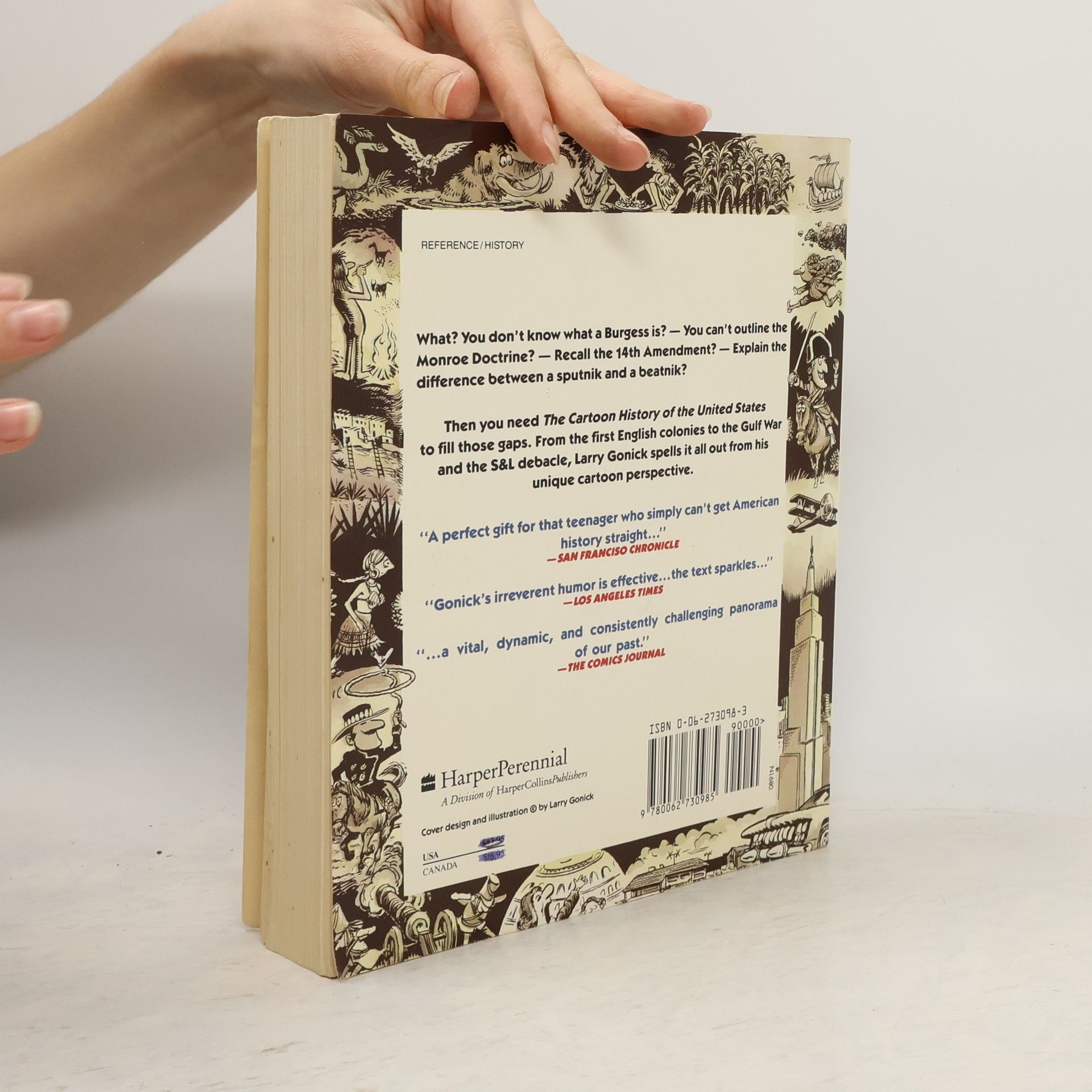 What? You don't know what a Burgess is? -- You can't outline the Monroe Doctrine? -- Recall the 14th Amendment? -- Explain the difference between a sputnik and a beatnik?Then you need The Cartoon History of the United Statesto fill those gaps. From the first English colonies to the Gulf War and the S&L debacle, Larry Gonick spells it all out from his unique cartoon perspective.