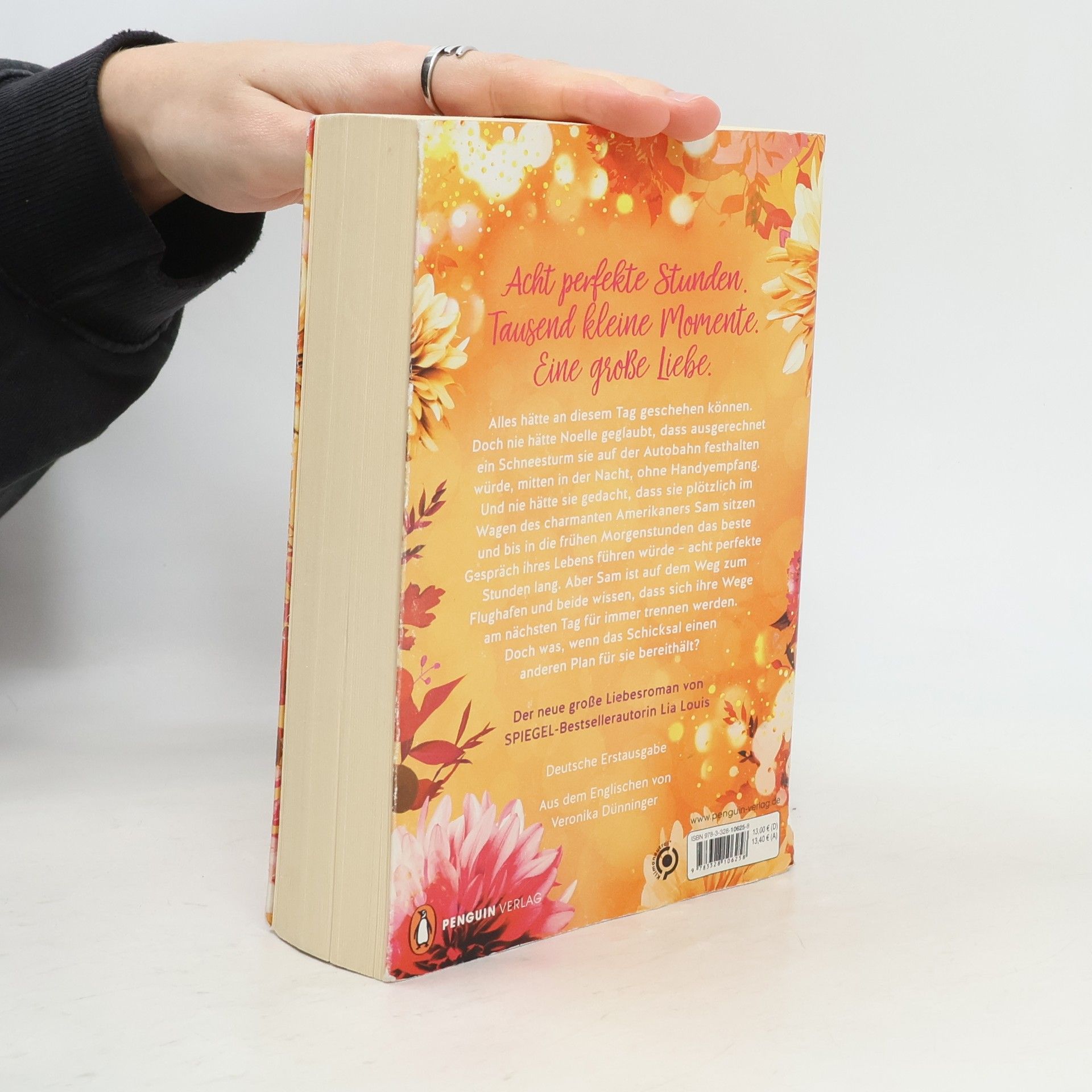Acht perfekte Stunden. Tausend kleine Momente. Eine große Liebe. Alles hätte an diesem Tag geschehen können. Doch nie hätte Noelle geglaubt, dass ausgerechnet an diesem Tag ein Schneesturm sie auf der Autobahn festhalten würde – mitten in der Nacht, ohne Handyempfang. Und nie hätte sie gedacht, dass sie plötzlich im Wagen des charmanten Amerikaners Sam sitzen und bis in die frühen Morgenstunden das beste Gespräch ihres Lebens führen würde – acht perfekte Stunden lang. Aber Sam ist auf dem Weg zum Flughafen und beide wissen, dass sich ihre Wege am nächsten Tag für immer trennen werden. Doch was, wenn das Schicksal einen anderen Plan für sie bereithält? Der romantische zweite Roman der SPIEGEL-Bestsellerautorin in Sonderausstattung: Funkelndes Perlmuttpapier lässt das Buch in goldenem Glanz erstrahlen Gleich weiterlesen: >>> Entdecken Sie auch Lia Louis' romantischen Bestseller »Jedes Jahr im Juni«. >>> Und in Kürze erhältlich, der große neue Roman der Bestsellerautorin: »Unser Lied für immer«.