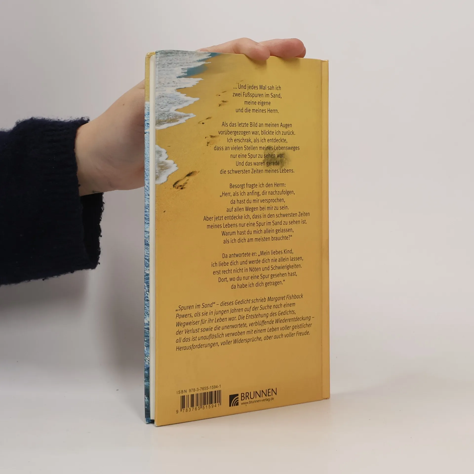 Dieses Gedicht schrieb M. Fishback Powers in einer tiefen Lebenskrise. Bevor sie an Gott und der Welt verzweifelt, bekommt sie die Antwort: „Mein liebes Kind, ich liebe dich und werde dich nie allein lassen, erst recht nicht in Nöten und Schwierigkeiten. Dort, wo du nur eine Spur gesehen hast, da habe ich dich getragen.“" Lesen Sie hier das Gedicht und seine Geschichte: Die Entstehung des Gedichts, der Verlust sowie die unerwartete Wiederentdeckung - als das ist unauflöslich verwoben mit einem Leben voller geistlicher Herausforderungen, voller Widersprüche, aber auch voller Freude.