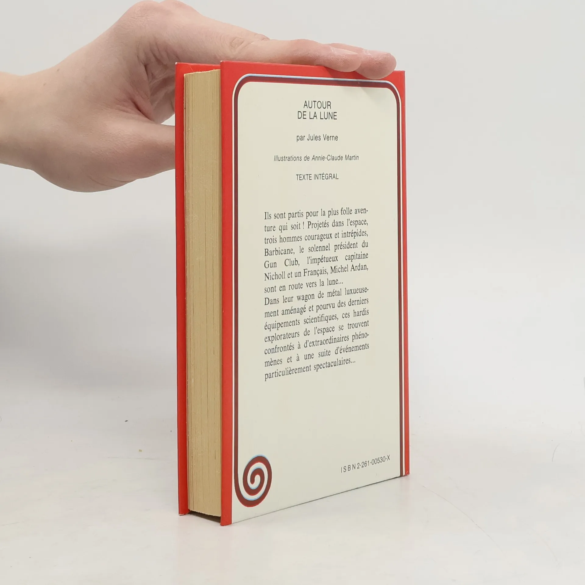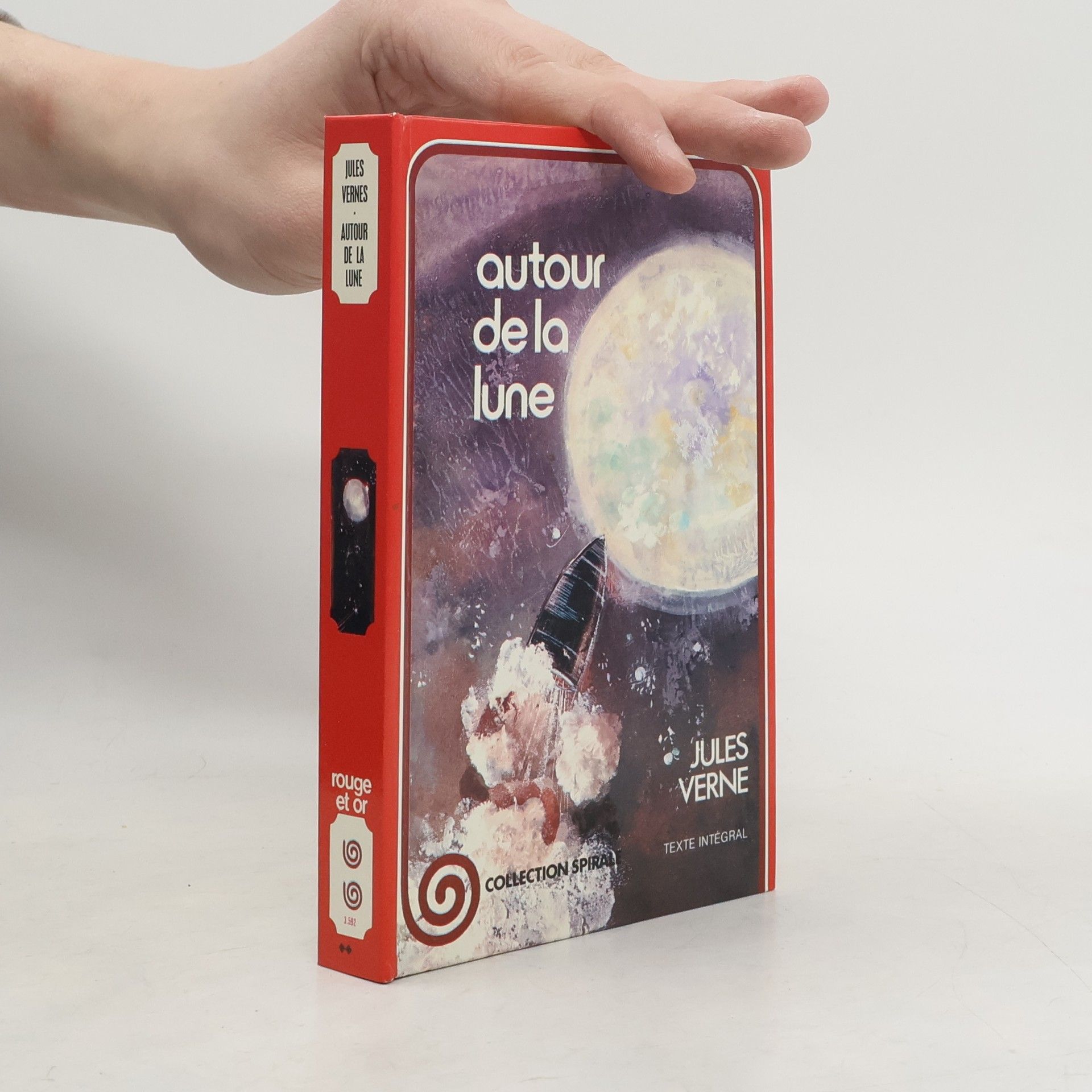 RO70040882. Autour de la lune.. 1978. In-12. Cartonnage d'éditeurs. Etat d'usage, Couv. convenable, Dos abîmé, Intérieur bon état. 315 pages. Couverture illustrée en couleurs. Illustrations en noir & blanc et en couleurs de Annie-Claude Martin. 282ème ouvrage de la Collection Spirale. gardes renforcées avec du scotch toilé blanc. Dos réparé avec du scotch marron. Tampon sur la page de titre.. . . . Classification Dewey : 843.0692-Livres d'enfants