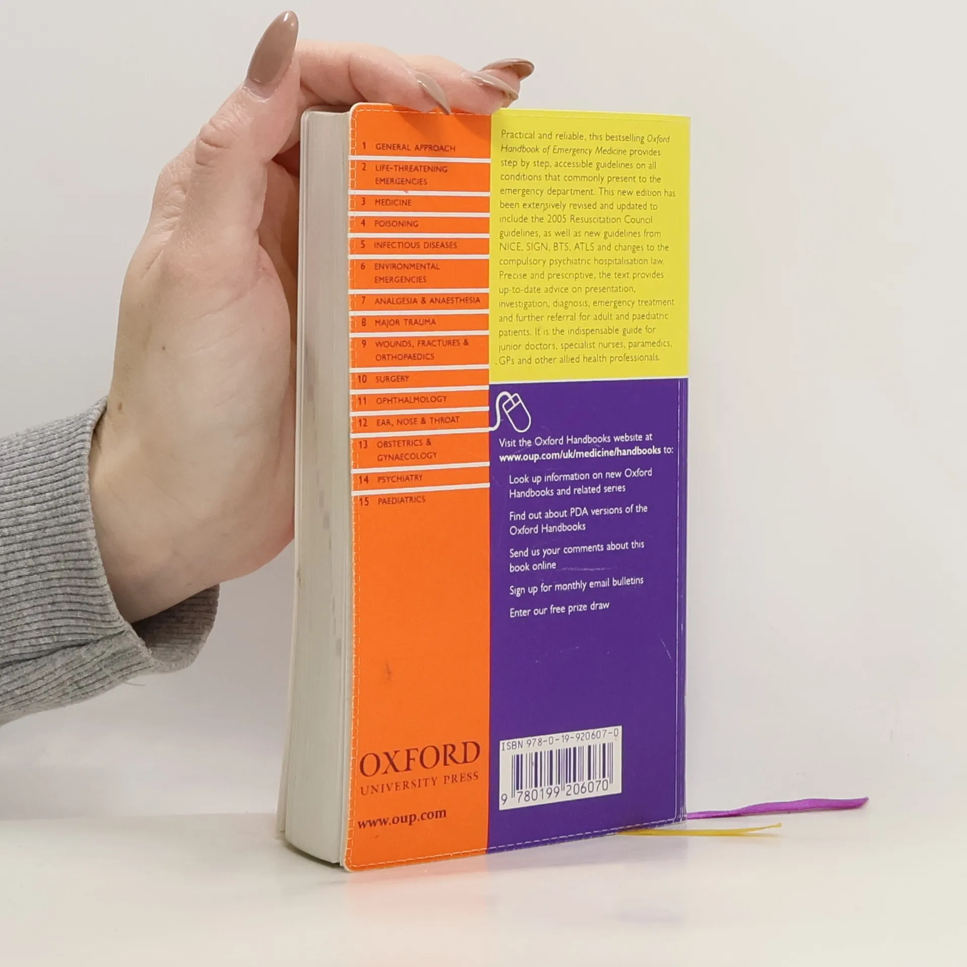 The bestselling Oxford Handbook of Emergency Medicine provides practical, accessible guidelines on a huge range of situations that present to the Emergency department. It is the essential guide for junior doctors (including candidates for examinations in Emergency Medicine), specialist nurses, paramedics, general practitioners and other allied health professionals. The text is deliberately precise and prescriptive giving up-to-date step-by-step advice on presentation, investigation, diagnosis, emergency treatment and further referral for adult and paediatric patients. Practical guidance on the management of a huge range of situations is provided including poisoning, major trauma, ob/gyn, psychiatric and paediatric emergencies. Important practical procedures are covered in a stepwise, easy-to-follow format with line diagrams illustrating anatomical landmarks. This new edition has been extensively revised and updated to include the 2006 Resuscitation Council guidelines, as well as new guidelines from NICE, SIGN, BTS, ATLS and changes to the compulsory psychiatric hospitalisation law. There are updates on management throughout and new information on avian flu, terrorism, hospital acquired infections including MRSA and hand washing.