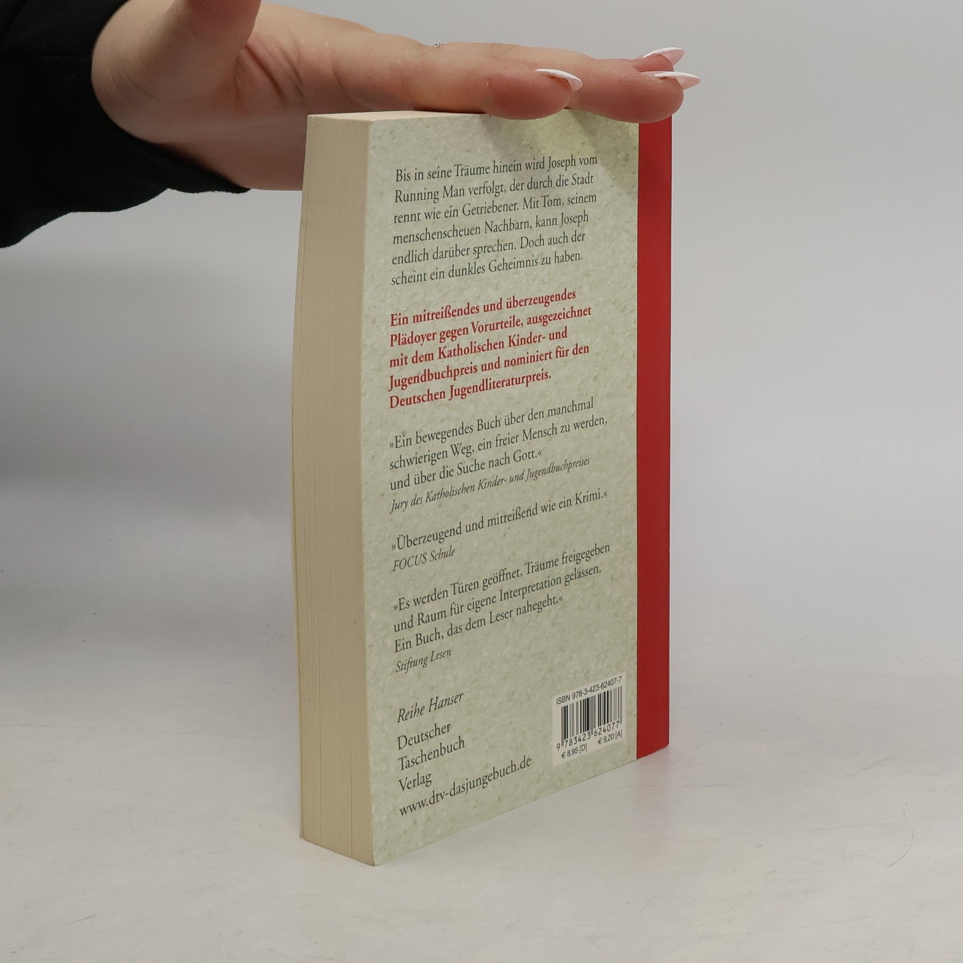 Verfolgt... von den eigenen Ängsten. Bis in seine Träume hinein wird Joseph vom Running Man verfolgt, der durch die Stadt läuft wie ein Getriebener. Der unheimliche Mann ist Josephs persönliche Albtraum-Figur. Noch nie hat er mit jemandem über ihn gesprochen. Doch die Bekanntschaft mit seinem menschenscheuen Nachbarn Tom verändert alles: Tom ist noch verschlossener als Joseph. Seit Jahren hat er sich von der Außenwelt zurückgezogen. Josephs Interesse begegnet er zunächst mit Abwehr. Erst als Joseph von seinen Ängsten und dem Running Man erzählt, scheint sich auch für Tom wieder eine Tür ins Leben zu öffnen. Zögerlich beginnt er, sein dunkles Geheimnis preiszugeben. Es ist nicht das Geheimnis, das Joseph erwartet hatte, aber das Gespräch darüber verändert sie beide. Auch Josephs Sicht auf den Running Man. • Ausgezeichnet mit dem Katholischen Kinder- und Jugendbuchpreis 2008 • Nominiert für den Deutschen Jugendliteraturpreis 2008 • Auf der Liste der ›Besten 7 Bücher für junge Leser‹