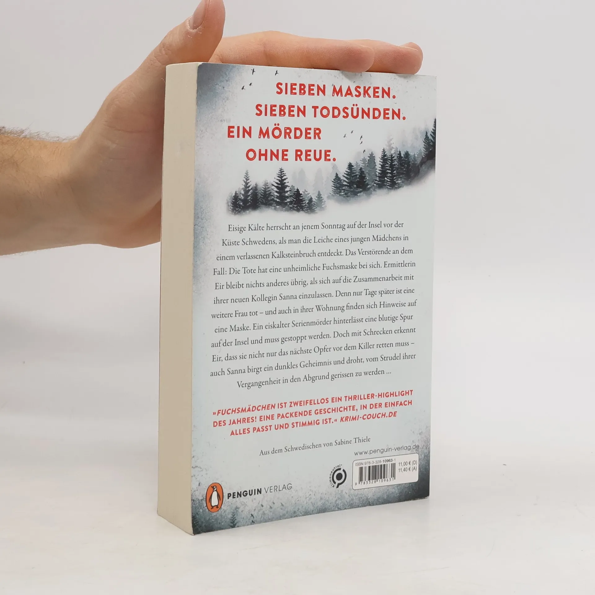 7 Masken. 7 Todsünden. Ein Mörder ohne Reue. Eisige Kälte herrscht an jenem Sonntag auf der Insel vor der Küste Schwedens, als man die Leiche eines jungen Mädchens in einem verlassenen Kalksteinbruch entdeckt. Das Verstörende an dem Fall: Die Tote hat eine unheimliche Fuchsmaske bei sich. Ermittlerin Eir bleibt nichts anderes übrig, als sich auf die Zusammenarbeit mit ihrer neuen Kollegin Sanna einzulassen. Denn nur Tage später ist eine weitere Frau tot – und auch in ihrer Wohnung finden sich Hinweise auf eine Maske. Ein eiskalter Serienmörder hinterlässt eine blutige Spur auf der Insel und muss gestoppt werden. Doch mit Schrecken erkennt Eir, dass nicht nur das nächste Opfer vor dem Killer retten muss – auch Sanna birgt ein dunkles Geheimnis und droht, vom Strudel ihrer Vergangenheit in den Abgrund gerissen zu werden … »Ein begnadetes Debüt mit einer ganz einzigartigen Stimme.« Dagens Nyheter Die Berling-und-Pedersen-Reihe geht weiter: 1. Fuchsmädchen 2. Rotwild