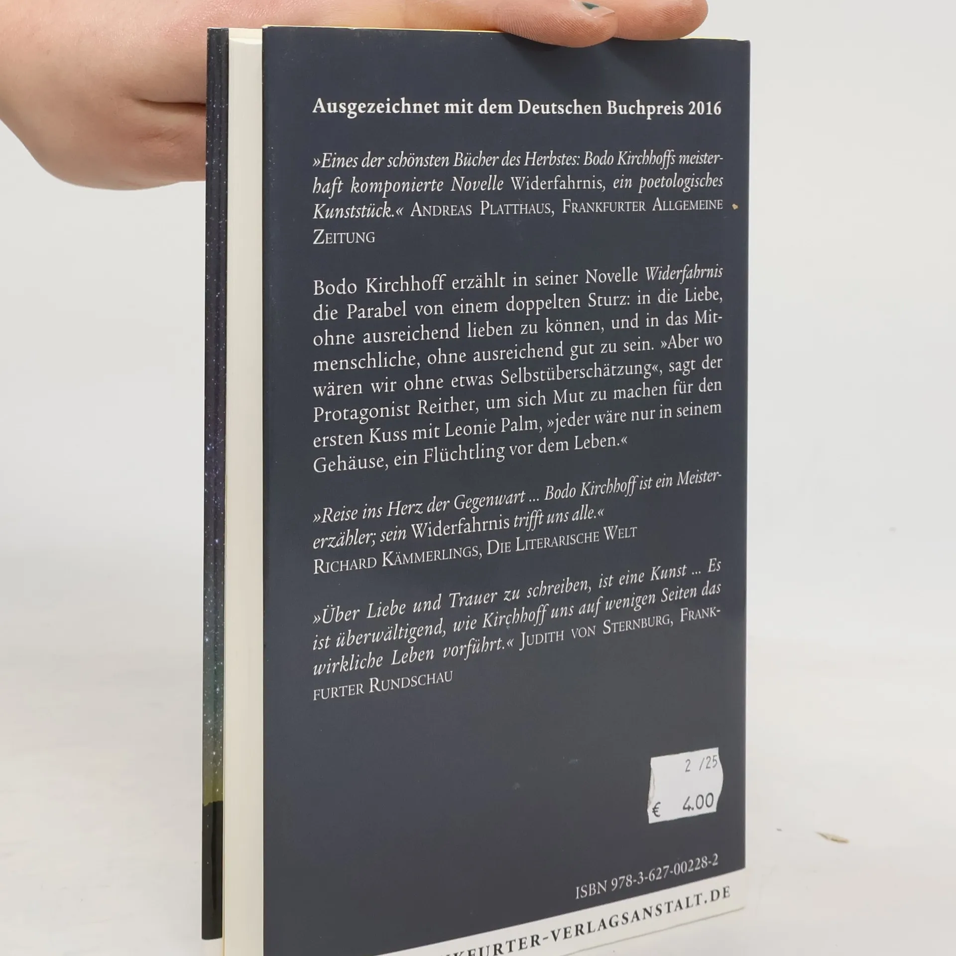 Reither, bis vor kurzem Kleinverleger in einer Großstadt, nun in einem idyllischen Tal am Alpenrand, hat in der dortigen Bibliothek ein Buch ohne Titel entdeckt, auf dem Umschlag nur der Name der Autorin, und als ihn das noch beschäftigt, klingelt es abends bei ihm. Und bereits in derselben Nacht beginnt sein Widerfahrnis und führt ihn binnen drei Tagen bis nach Sizilien. Die, die ihn an die Hand nimmt, ist Leonie Palm, zuletzt Besitzerin eines Hutgeschäfts; sie hat ihren Laden geschlossen, weil es der Zeit an Hutgesichtern fehlt, und er seinen Verlag dichtgemacht, weil es zunehmend mehr Schreibende als Lesende gibt. Aber noch stärker verbindet die beiden, dass sie nicht mehr auf die große Liebe vorbereitet zu sein scheinen. Als dann nach drei Tagen im Auto am Mittelmeer das Glück über sie hereinbricht, schließt sich ihnen ein Mädchen an, das kein Wort redet, nur da ist… Kirchhoff erzählt in seiner großartigen Novelle von der Möglichkeit einer Liebe sowie die Parabel von einem doppelten Sturz: in die Liebe, ohne ausreichend lieben zu können, und in das Mitmenschliche, ohne ausreichend gut zu sein. »Aber wo wären wir ohne etwas Selbstüberschätzung«, sagt der Protagonist Reither, um sich Mut zu machen für den ersten Kuss mit Leonie Palm, »jeder wäre nur in seinem Gehäuse, ein Flüchtling vor dem Leben.« Ausgezeichnet mit dem Deutschen Buchpreis 2016