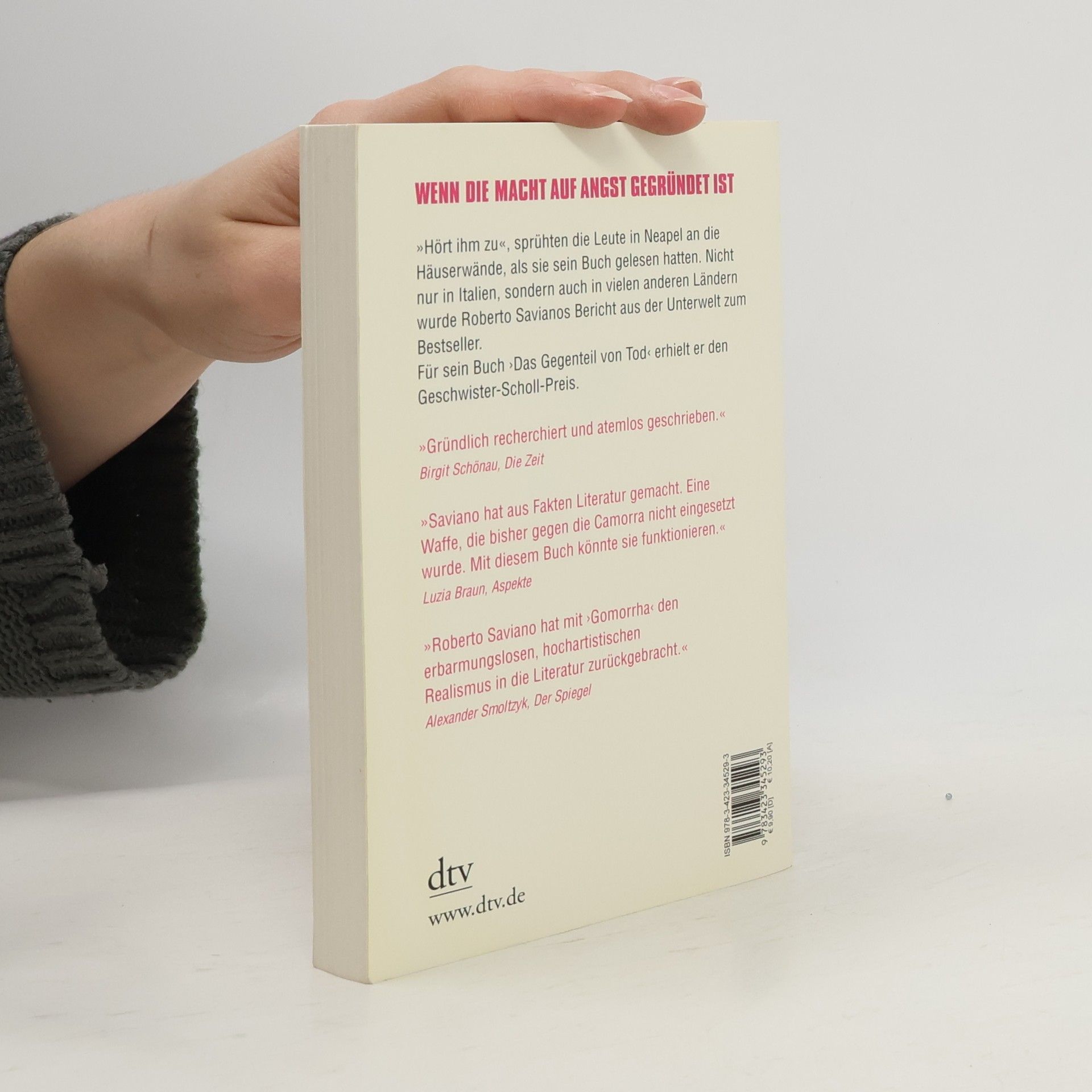 Die süditalienische Camorra ist tief im internationalen Drogenhandel verwickelt, transportiert große Mengen Giftmüll und dominiert den Textil- sowie Zementhandel. Ihre Aktivitäten erstrecken sich bis nach Deutschland, Schottland und China und fordern jährlich hunderte von Opfern. Der junge Journalist Roberto Saviano, selbst aus Neapel stammend, hat unter Lebensgefahr vor Ort recherchiert und ein eindringliches Buch verfasst, das die Macht der Camorra beleuchtet. Diese beruht auf Schweigen, dem Saviano die Kraft des Wortes entgegensetzt. Aufgrund seiner Enthüllungen lebt er seitdem versteckt und wird von Bodyguards beschützt. Für sein engagiertes Schreiben erhielt Saviano 2009 den Geschwister-Scholl-Preis, nicht nur für sein Buch, sondern für seinen gesamten Beitrag zur Aufklärung über die Verbrechen der Camorra. In seiner Dankesrede thematisiert er den täglichen Kampf gegen die Einschüchterungen und die Notwendigkeit, trotz aller Bedrohungen zu schreiben. Für ihn bedeutet Schreiben, sich nicht von Angst und Verzweiflung besiegen zu lassen und dem eigenen Gewissen treu zu bleiben.