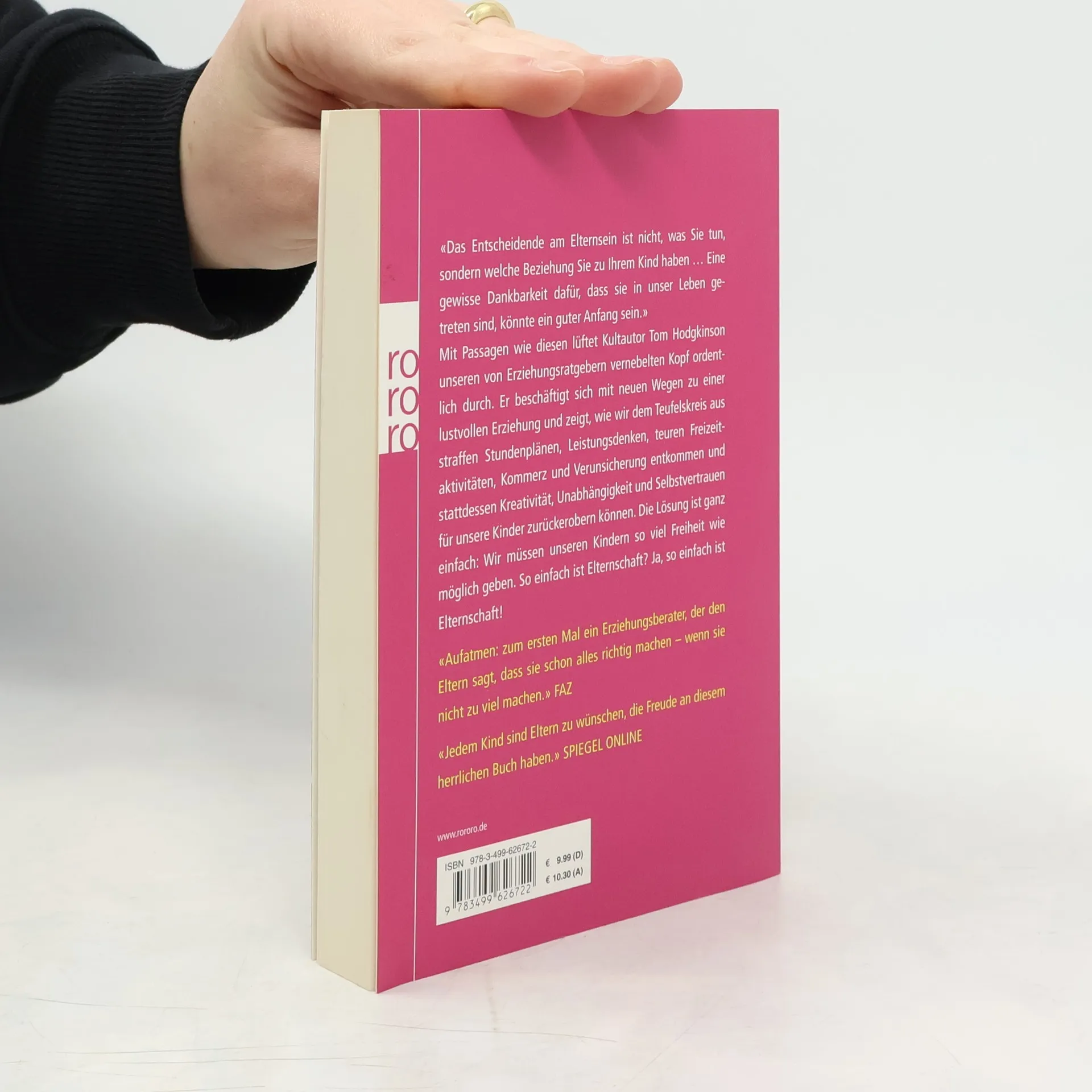 «Das Entscheidende am Elternsein ist nicht, was Sie tun, sondern welche Beziehung Sie zu Ihrem Kind haben … Eine gewisse Dankbarkeit dafür, dass sie in unser Leben getreten sind, könnte ein guter Anfang sein.» Mit Passagen wie diesen lüftet Kultautor Tom Hodgkinson unseren von Erziehungsratgebern vernebelten Kopf ordentlich durch. Er beschäftigt sich mit neuen Wegen zu einer lustvollen Erziehung und zeigt, wie wir dem Teufelskreis aus straffen Stundenplänen, Leistungsdenken, teuren Freizeitaktivitäten, Kommerz und Verunsicherung entkommen und stattdessen Kreativität, Unabhängigkeit und Selbstvertrauen für unsere Kinder zurückerobern können. Die Lösung ist ganz einfach: Wir müssen unseren Kindern so viel Freiheit wie möglich geben. So einfach ist Elternschaft? Ja, so einfach ist Elternschaft!«Aufatmen: zum ersten Mal ein Erziehungsberater, der den Eltern sagt, dass sie schon alles richtig machen – wenn sie nicht zu viel machen.» FAZ«Jedem Kind sind Eltern zu wünschen, die Freude an diesem herrlichen Buch haben.» SPIEGEL ONLINE
