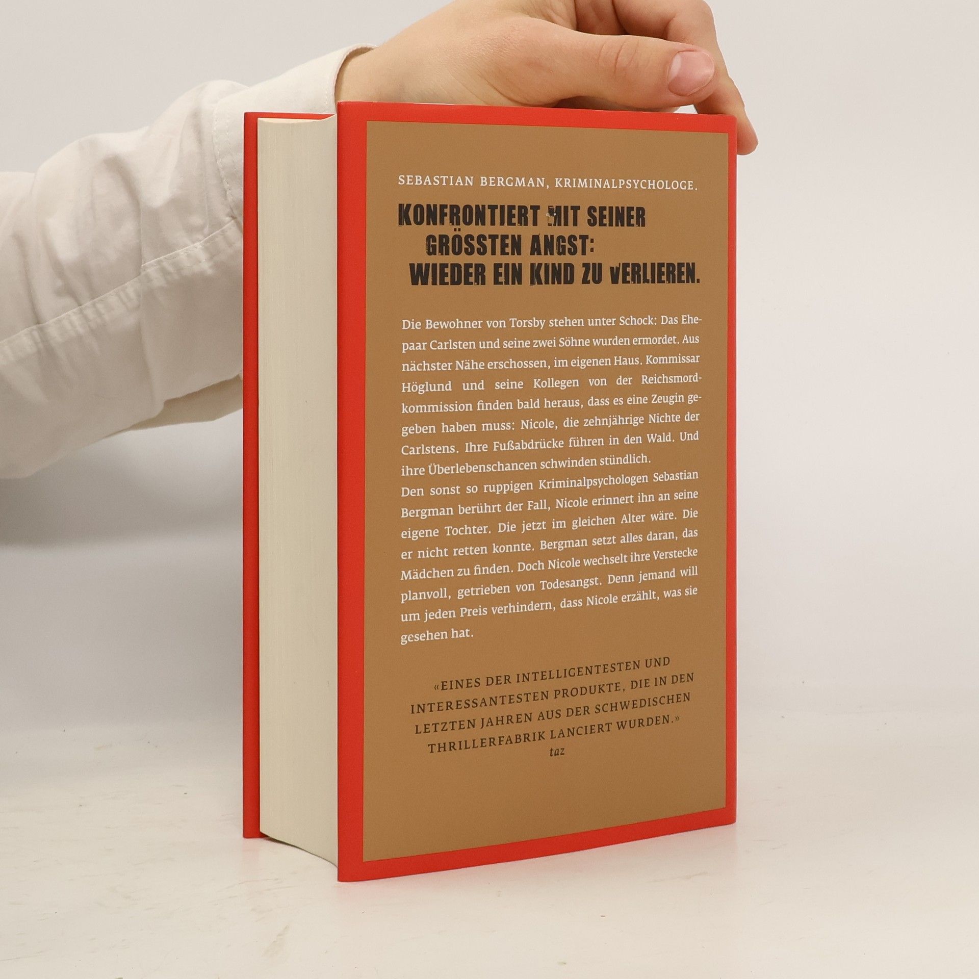 Sebastian Bergman, Kriminalpsychologe. Konfrontiert mit seiner größten Angst: Wieder ein Kind zu verlieren.Die Bewohner von Torsby stehen unter Schock: Das Ehepaar Carlsten und seine zwei Söhne wurden ermordet. Aus nächster Nähe erschossen, im eigenen Haus. Kommissar Torkel Höglund und seine Kollegen von der Reichsmordkommission finden bald heraus, dass es eine Zeugin gegeben haben muss: Nicole, die zehnjährige Nichte der Carlstens. Ihre Fußabdrücke führen in den Wald. Und ihre Überlebenschancen schwinden stündlich. Den sonst so ruppigen Kriminalpsychologen Sebastian Bergman berührt der Fall, Nicole erinnert ihn an seine eigene Tochter. Die jetzt im gleichen Alter wäre. Die er nicht retten konnte. Bergman setzt alles daran, das Mädchen zu finden. Doch Nicole wechselt ihre Verstecke planvoll, getrieben von Todesangst. Denn jemand will um jeden Preis verhindern, dass Nicole erzählt, was sie gesehen hat.