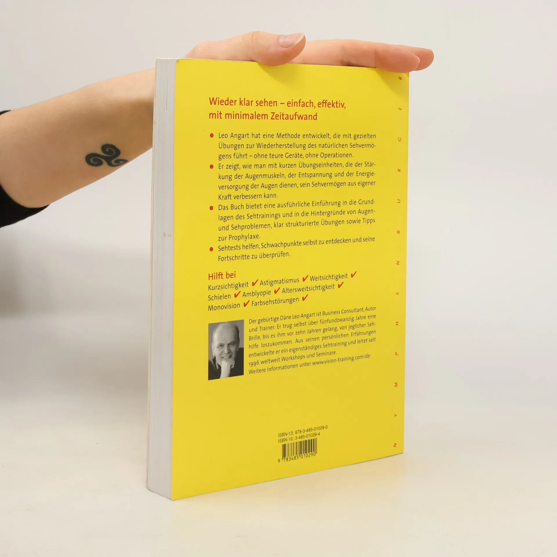 Leo Angart hat eine Methode entwickelt, die mit gezielten Übungen zur Wiederherstellung des natürlichen Sehvermögens führt - ohne teure Geräte, ohne Operationen. Er zeigt, wie man mit kurzen Übungseinheiten, die der Stärkung der Augenmuskeln, der Entspannung und der Energieversorgung der Augen dienen, sein Sehvermögen aus eigener Kraft verbessern kann. Das Buch bietet eine ausführliche Einführung in die Grundlagen des Sehtrainings und in die Hintergründe von Augen- und Sehproblemen, klar strukturierte Übungen sowie Tipps zur Prophylaxe. Sehtests helfen, Schwachpunkte selbst zu entdecken und seine Fortschritte zu überprüfen. Hilft bei: Kurzsichtigkeit, Astigmatismus, Weitsichtigkeit, Schielen, Amblyopie, Altersweitsichtigkeit, Monovision, Farbsehstörungen.