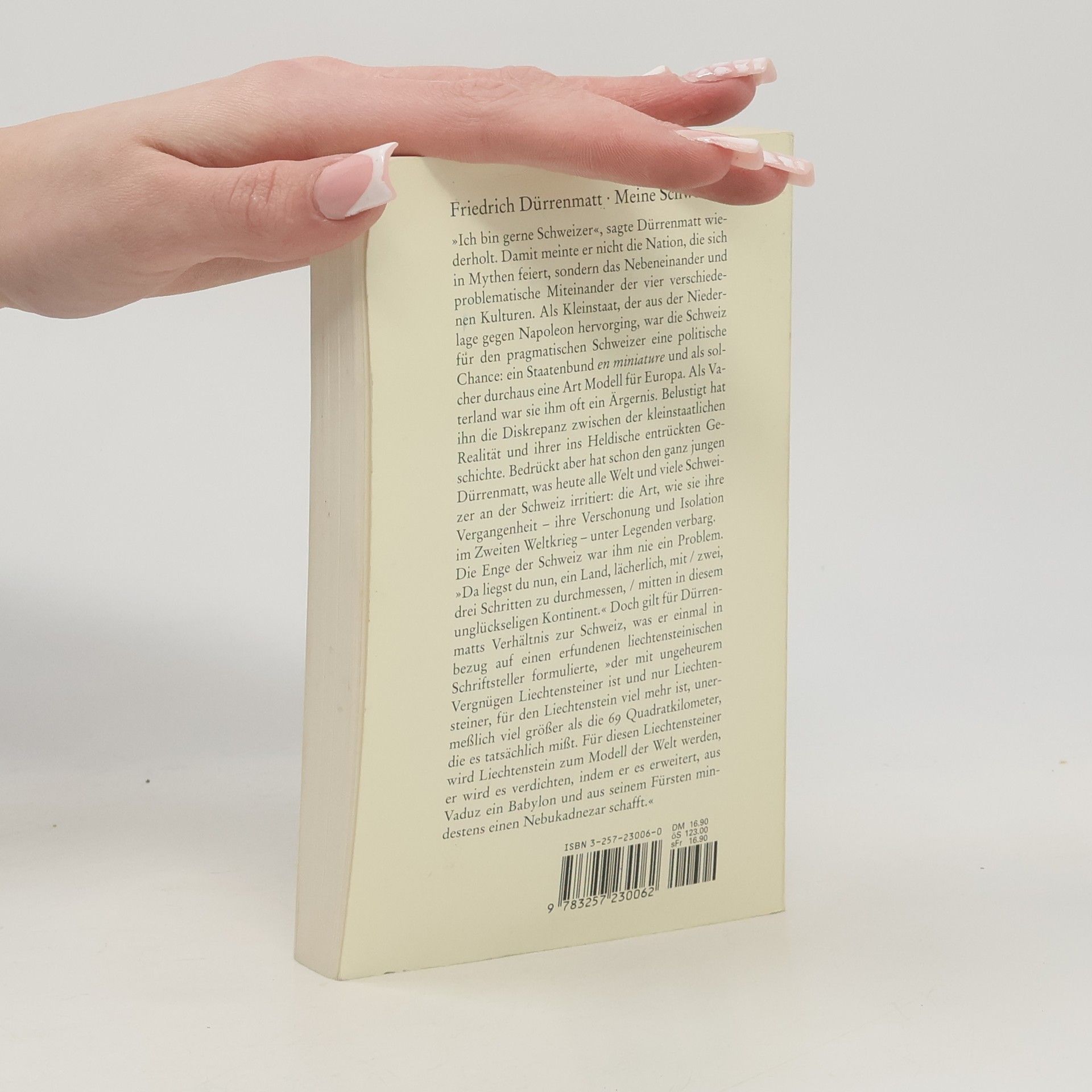 »Ich bin gerne Schweizer«, sagte Dürrenmatt. Damit meinte er nicht die Nation, die sich in Mythen feiert, sondern das Nebeneinander und problematische Miteinander der vier verschiedenen Kulturen. Als Kleinstaat war die Schweiz für den pragmatischen Schweizer eine politische Chance: ein Staatenbund en miniature und als solcher durchaus eine Art Modell für Europa. Als Vaterland war sie ihm oft ein Ärgernis.