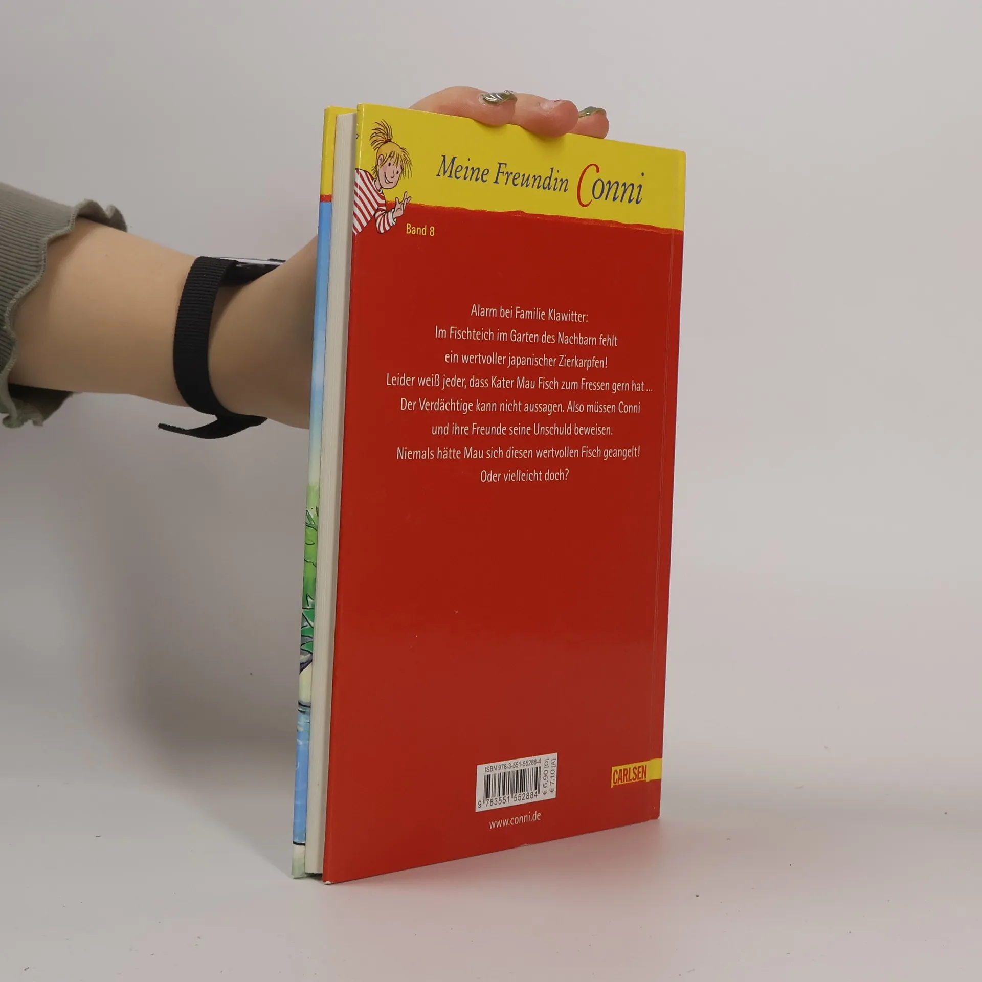Alarm bei Familie Klawitter: Im Fischteich im Garten des Nachbarn fehlt ein wertvoller japanischer Zierkarpfen. Leider weiß jeder, dass Kater Mau Fisch zum Fressen gern hat. Der Verdächtige kann nicht aussagen. Also müssen Conni und ihre Freunde seine Unschuld beweisen. Niemals hätte Mau sich diesen wertvollen Fisch geangelt! Oder vielleicht doch?